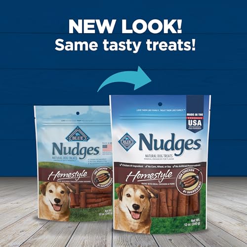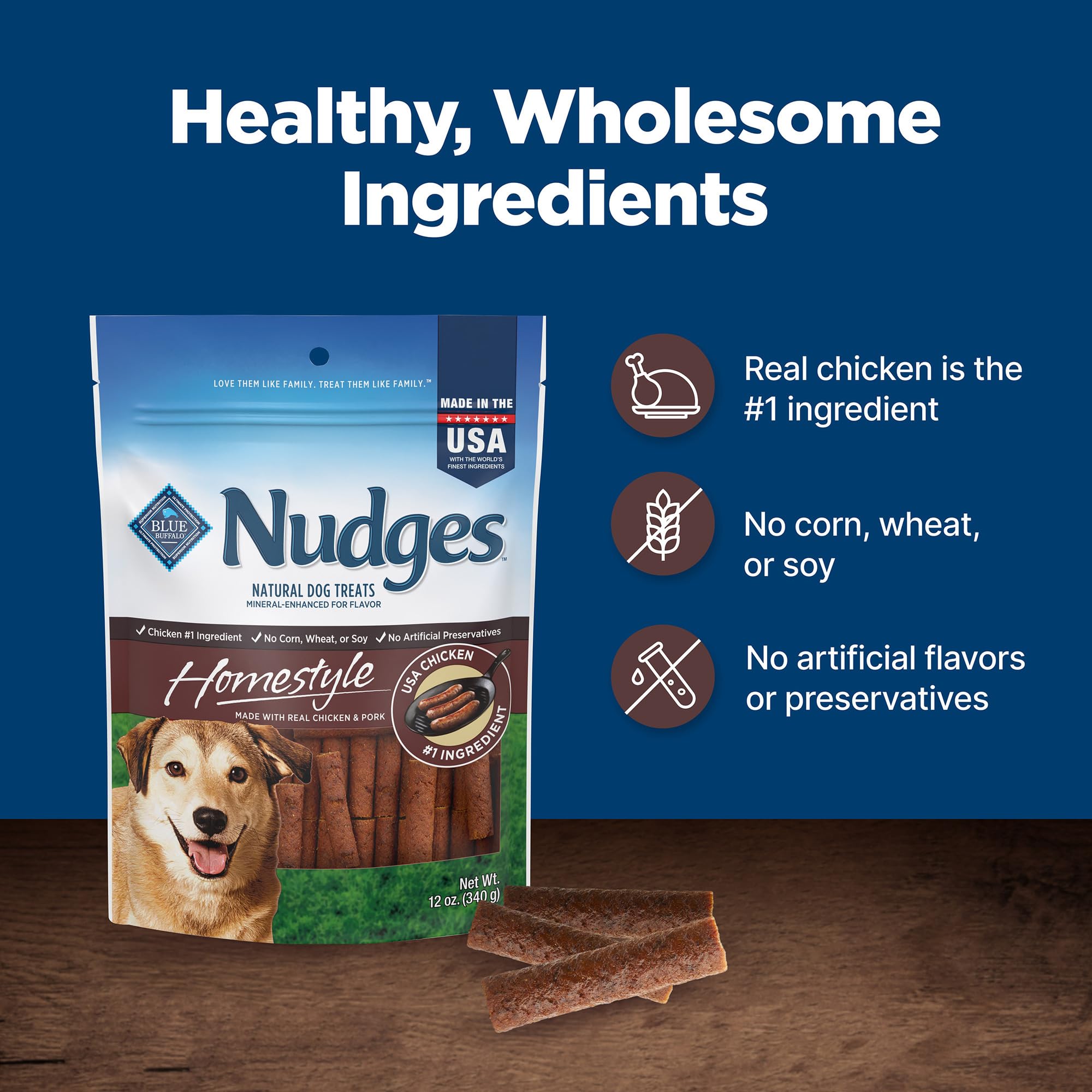 PACKAGING MAY VARY: Contains One (1) 12oz bag of BLUE Nudges Homestyle Natural Dog Treats, Chicken and Pork
