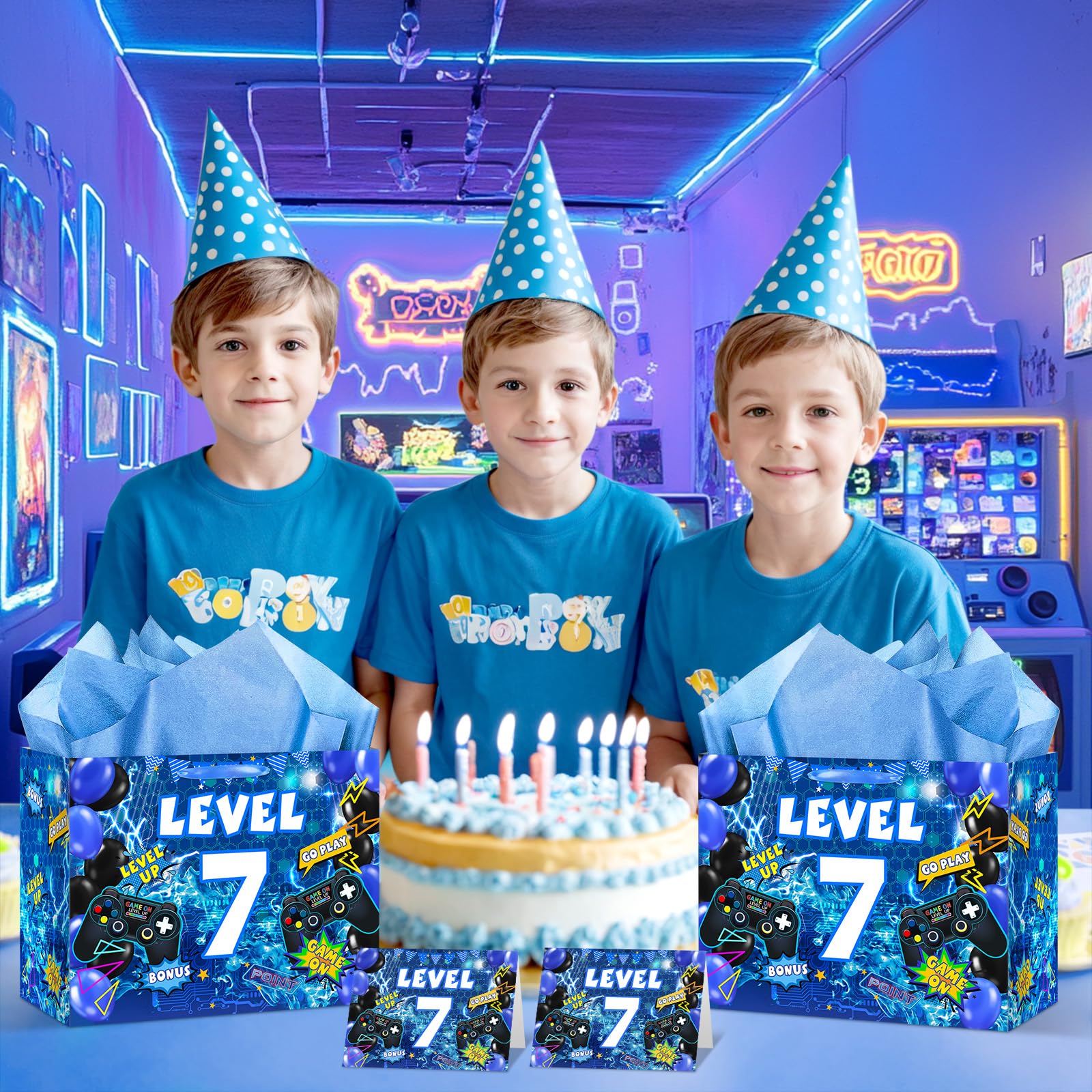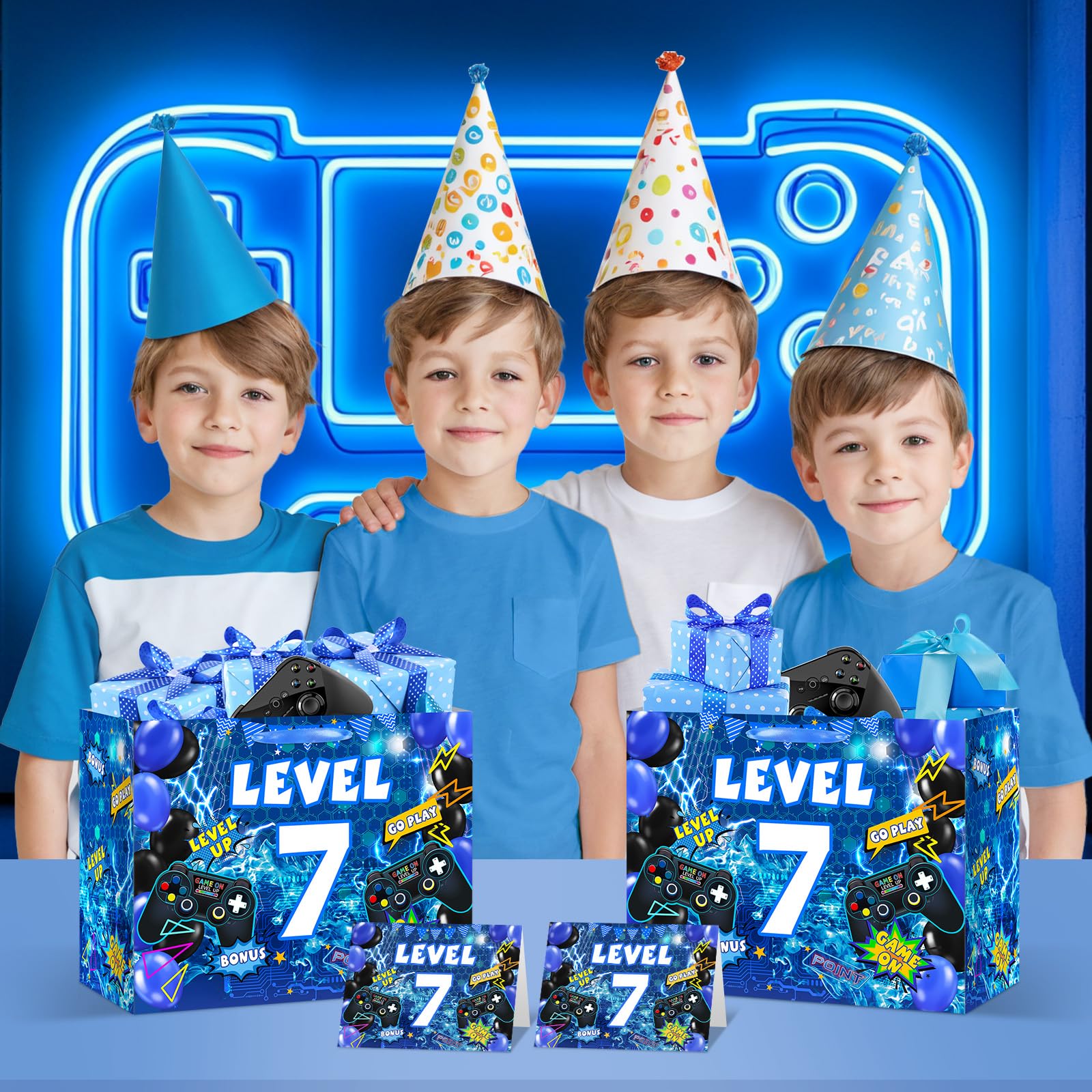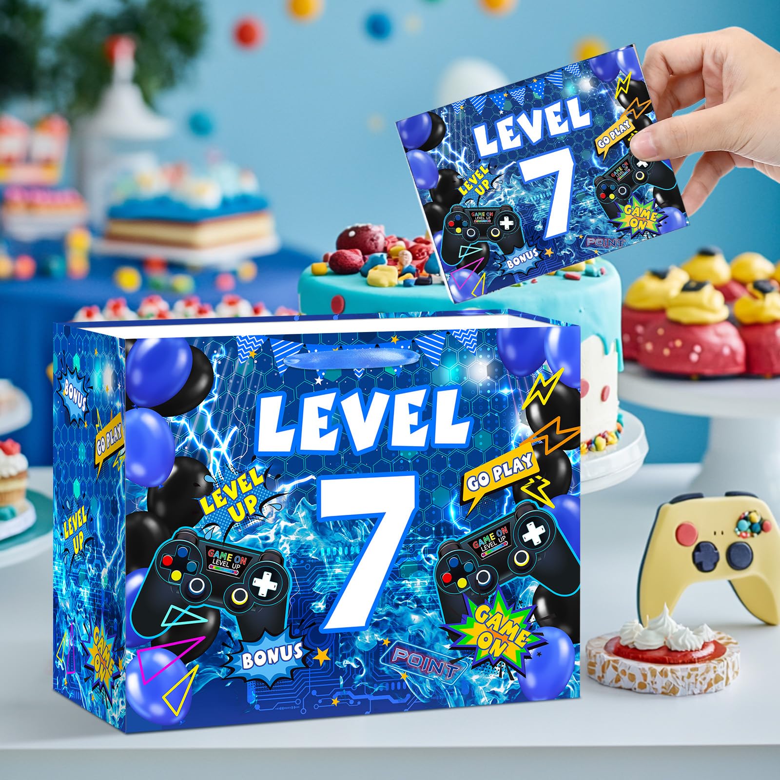 Blue game theme 7th birthday gift bags: Our video game 7th birthday party favor bags include a gaming gift bag, a gamer happy 7th birthday greeting card, and three easy-to-wrap wrapping papers. In addition, the gaming 7th birthday party goody bags is perfect for gifting to game lovers
