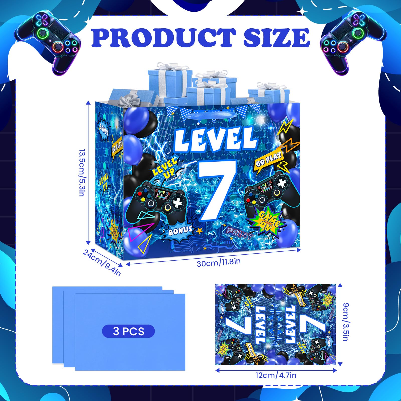 Material: Paper Size: Gaming Gift Bag:11.8 x 9.4 x 5.3inch gamer happy 7th birthday greeting card: 4.7 x 7inch Game Wrapping Tissue Paper: 27.5inch x 20inch Package includes: 1x Video Game Goody Bag 1x gamer happy 7th birthday greeting card 3x Game Wrapping Tissue Paper Note: Due to manual measurement, please allow a slight deviation. There may be color differences due to different monitors.