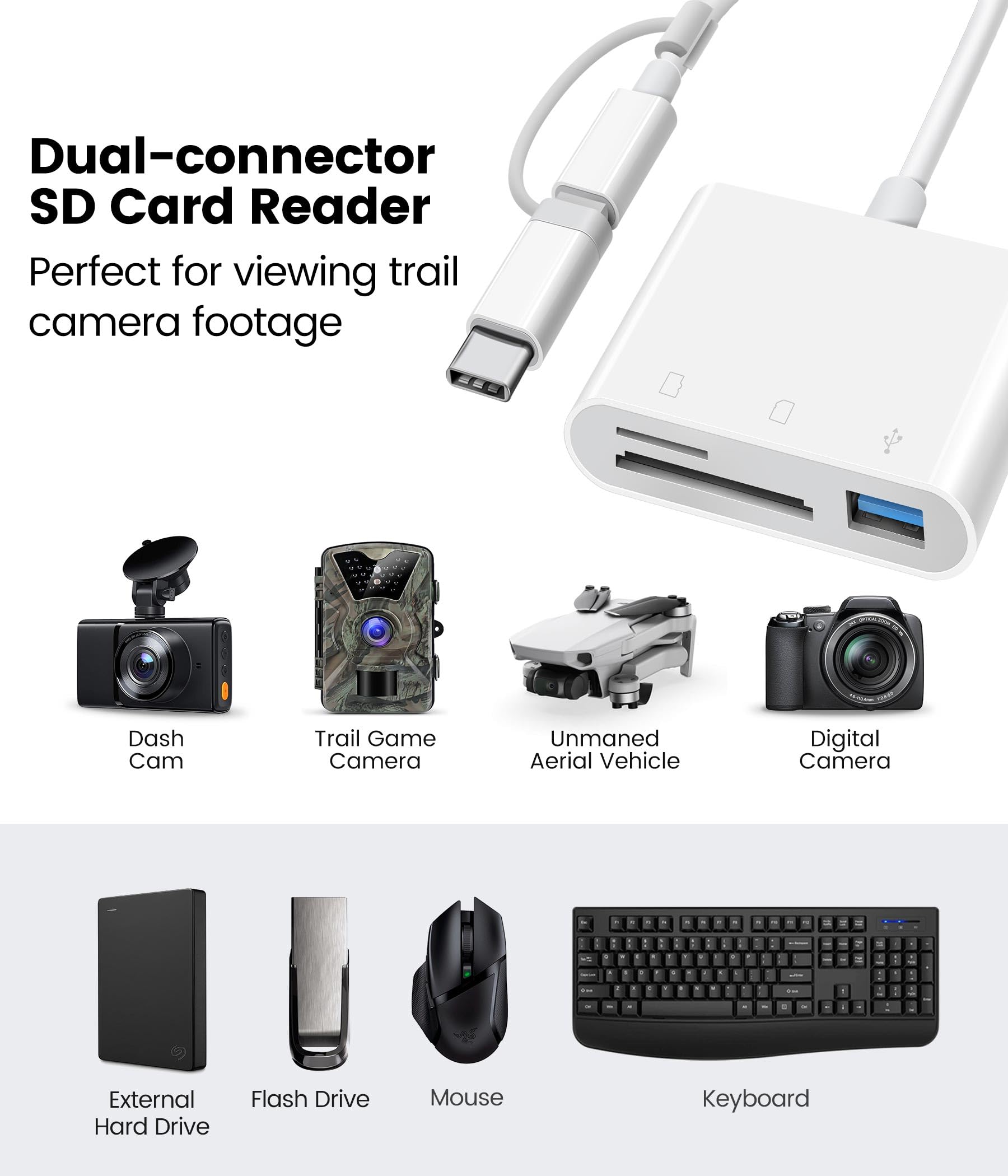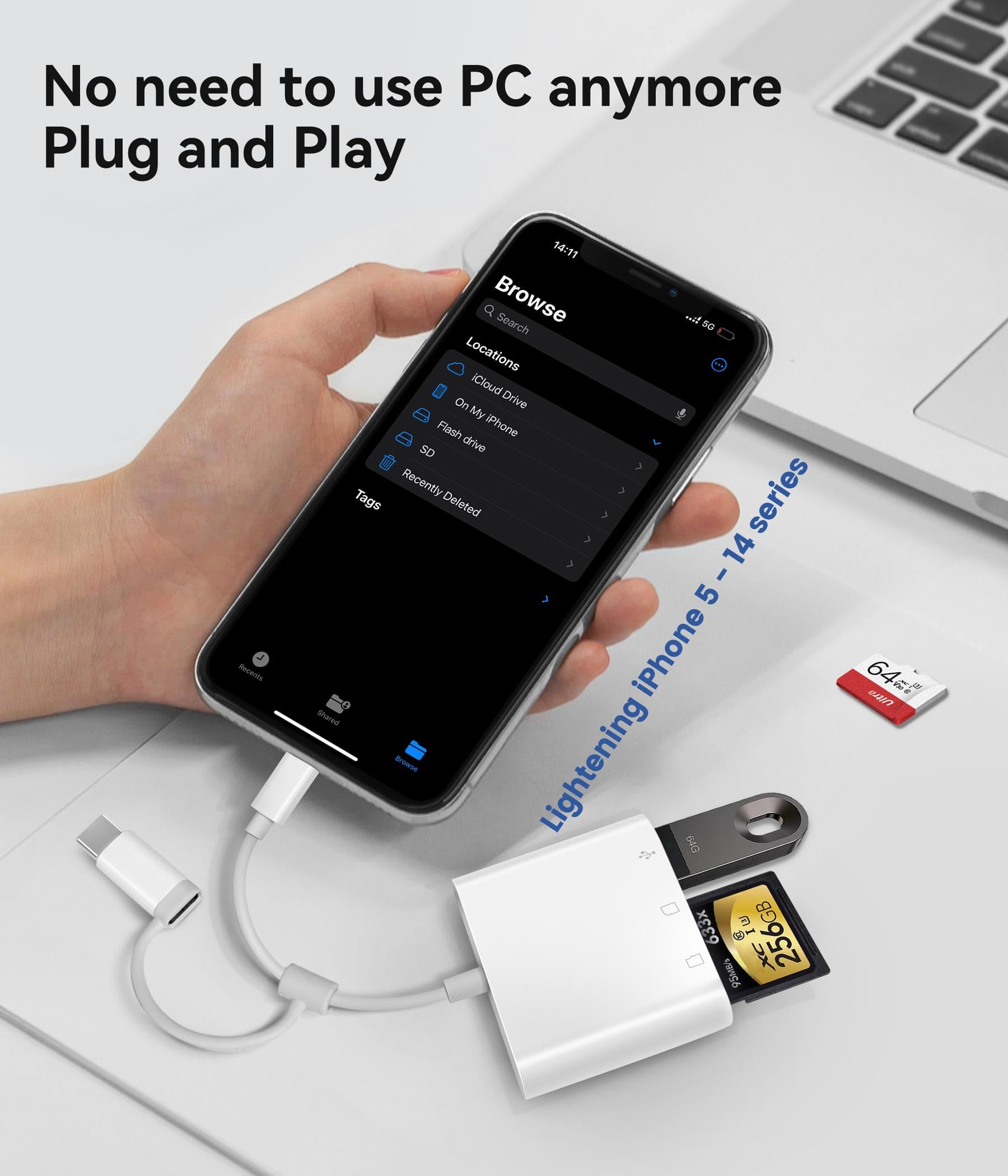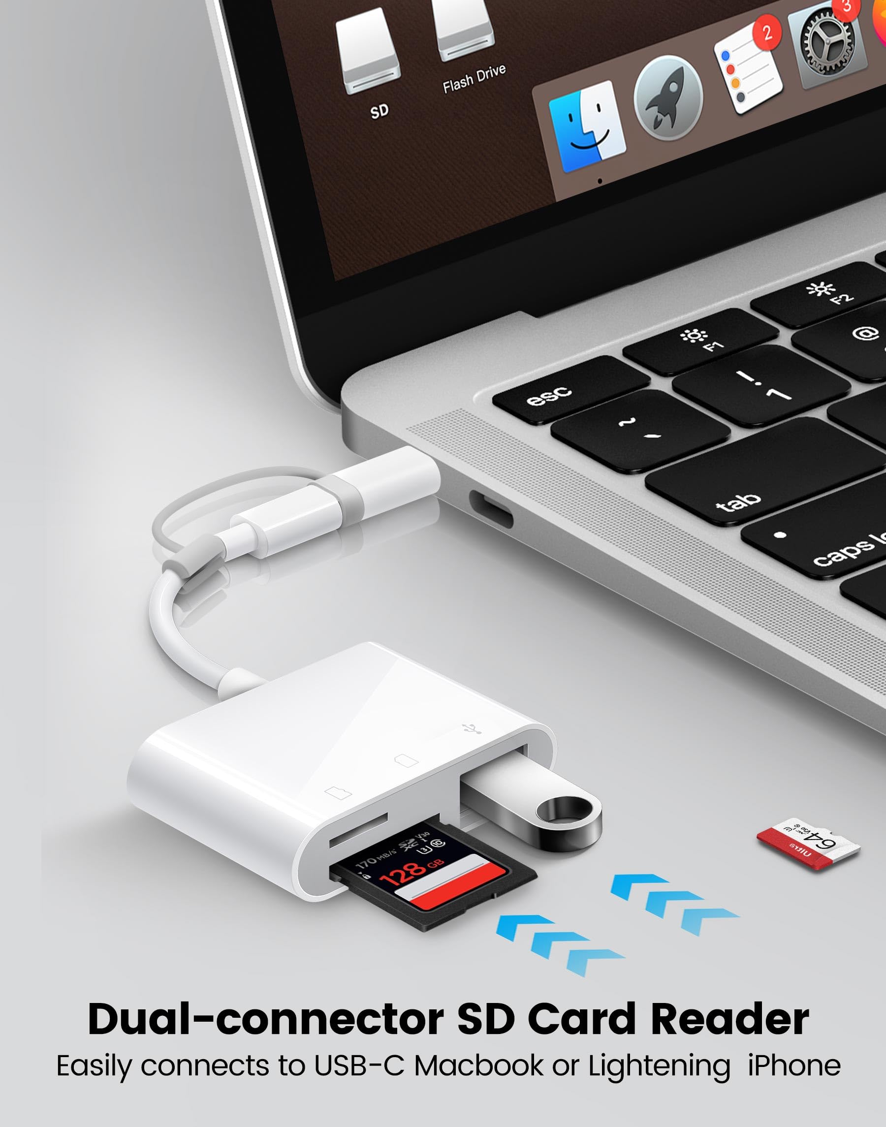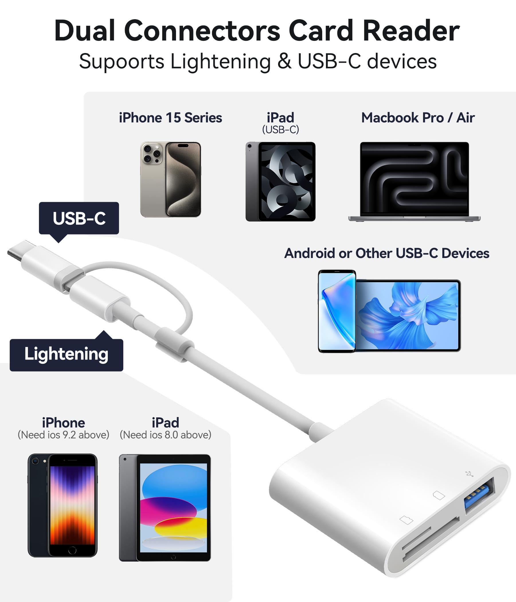 Dual-Connector : The inclusion of both a Lightening cord card reader and a USB-C to lightening adaptor, ensuring compatibility with almost all your gadgets, from iPhone 5 - 14 to your USB-C iPhone 15, iPad, Macbook, Mac, Laptop or Android Devices.