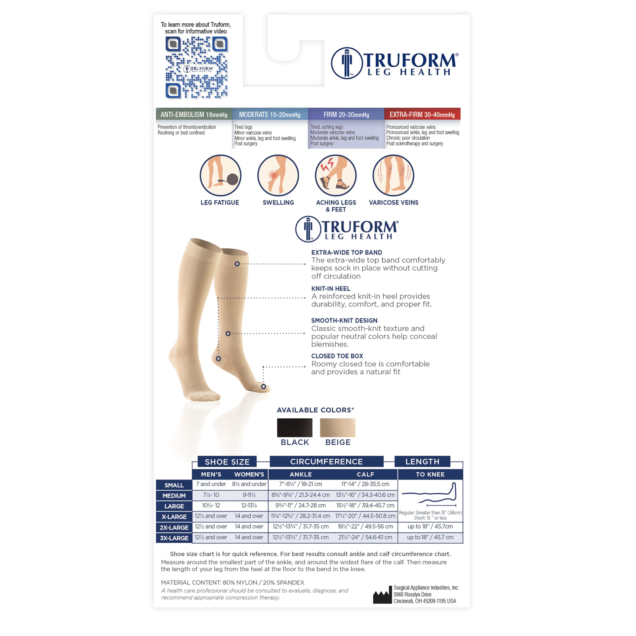 Product Description Truform 8865 was created to help treat conditions associated with poor circulation. Graduated compression technology delivers a compressive action to the leg that is greatest at the ankle, then gradually decreases toward the heart. The 20-30 mmHg Firm compression level is great for post surgery and severe edema, varicose veins, ypotension, post thrombotic syndrome (PTS), post sclerotherapy, and more. Truform therapeutic medical stockings feature classic styling and a smooth knit fabric that helps conceal unsightly conditions. The closed toe offers a more natural stocking feel. Color options are basic neutrals for all-occasion wear. Truform stockings, socks and pantyhose feature Graduated Compression Technology, which delivers a compressive action to the leg that is greatest at the ankle, then gradually decreases toward the heart. Graduated compression provides two primary benefits: it helps treat and lessen swelling for the wearer, and the compression action help to treat the slowing of blood flow so it can flow more quickly up the leg back toward the heart. Truform graduated compression support hosiery helps maintain positive circulation and leg health. We take the extra time and effort necessary to insure a therapeutically effective, comfortable fit. The combination of state-of-the-art materials and equipment, plus knitting know-how sets Truform apart from the crowd to make your legs look and feel great. Choose short length size when length from heel at floor to back bend of kne measures less than 15 inches. Manufacturer Contact Information 3960 Rosslyn Dr, Cincinnati, OH 45209