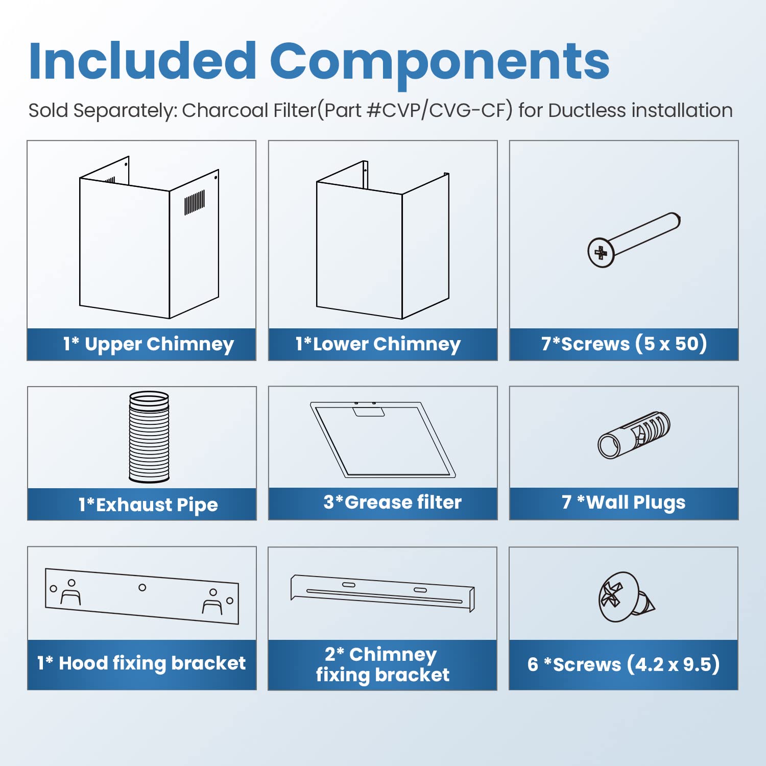 【What’s In The Box】 This Range Hood package includes (3) Aluminum Filter Filters, (2) Adjustable Strainless Steel Decorative Cover and (1) Screw Pack. NOT INCLUDED: For Ductless Installation: The Comfee 2 Pack Carbon Filter Kit can be purchased separately: Part # CVP/CVG-CF (Please search B09C74226L on Amazon.)