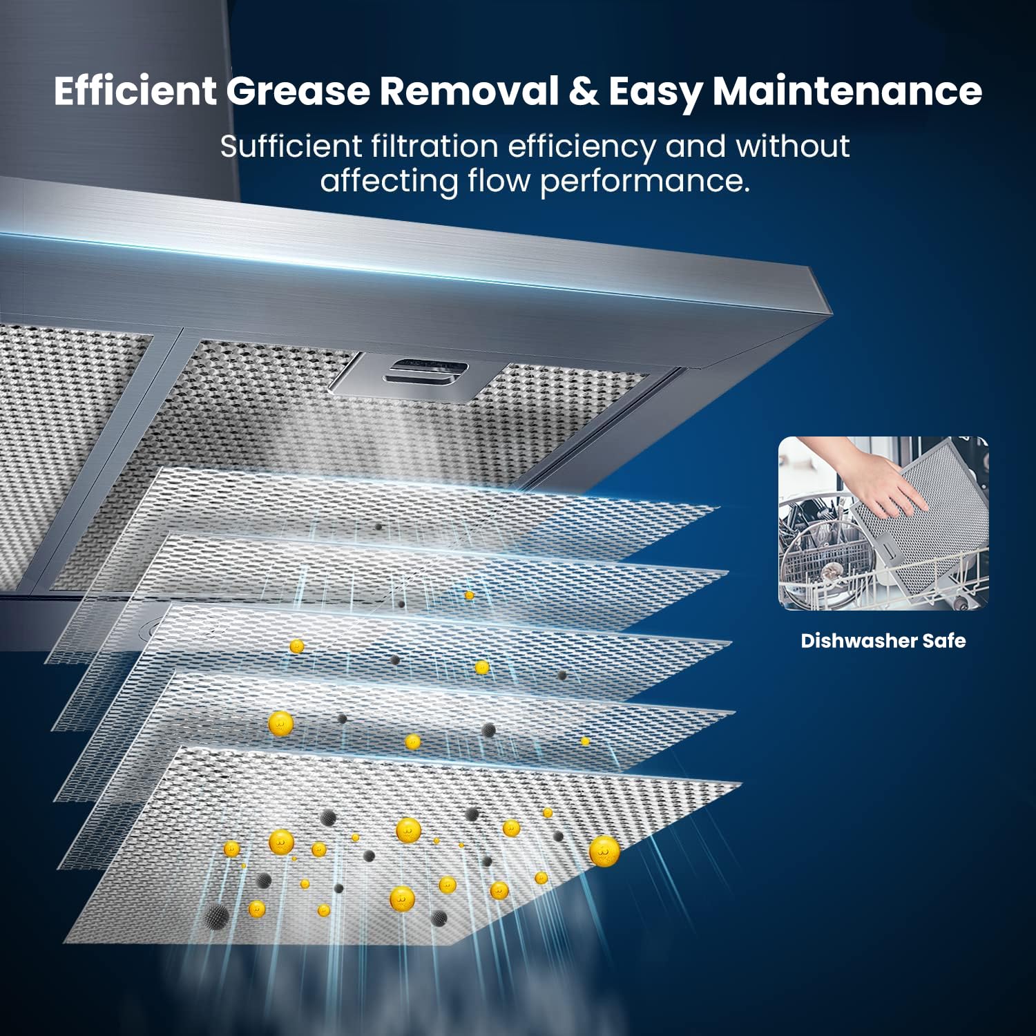 【5-Layer Reusable Aluminum Filter 】 The 5-layer aluminum filter effectively removes grease and cooking odors. Also, being easily detached and dishwasher safe, it can always sustain its optimal efficiency.