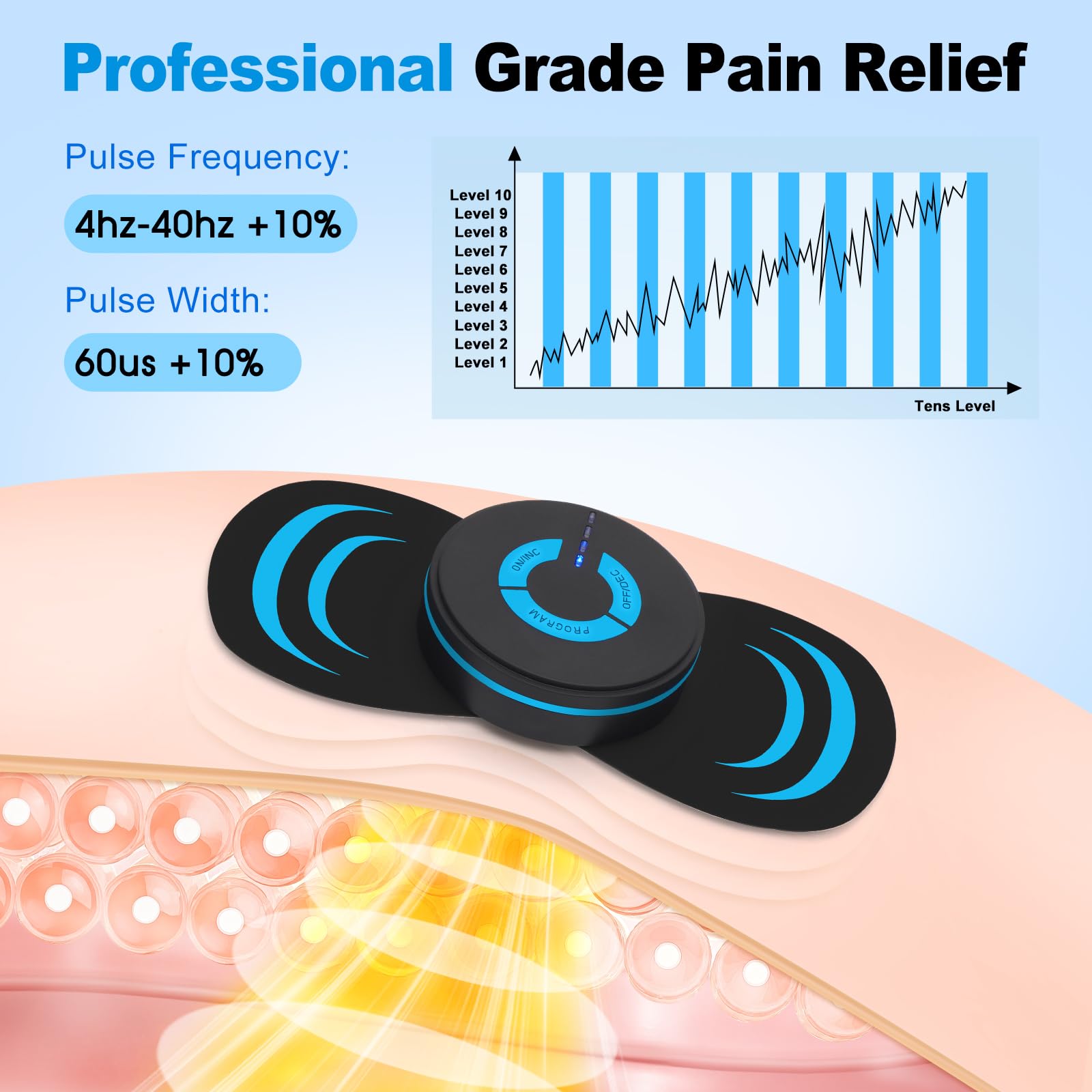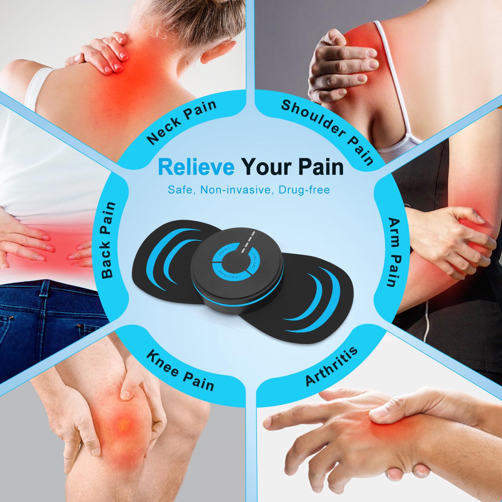 【Unique 6 modes 10 intensities】: You really have to try and feel the great benefits that this wireless TENS device muscle stimulator brings to you! It has 6 unique massage modes of acupressure, scraping, patting, acupuncture, kneading and beating, all of which provide unique electrical stimulation, and each mode can be switched from level 1 to level 10. Customers can freely choose a more precise electrical stimulation muscle massage program for different painful parts to adapt to your different massage needs and effectively relieve your muscle pain and fatigue.