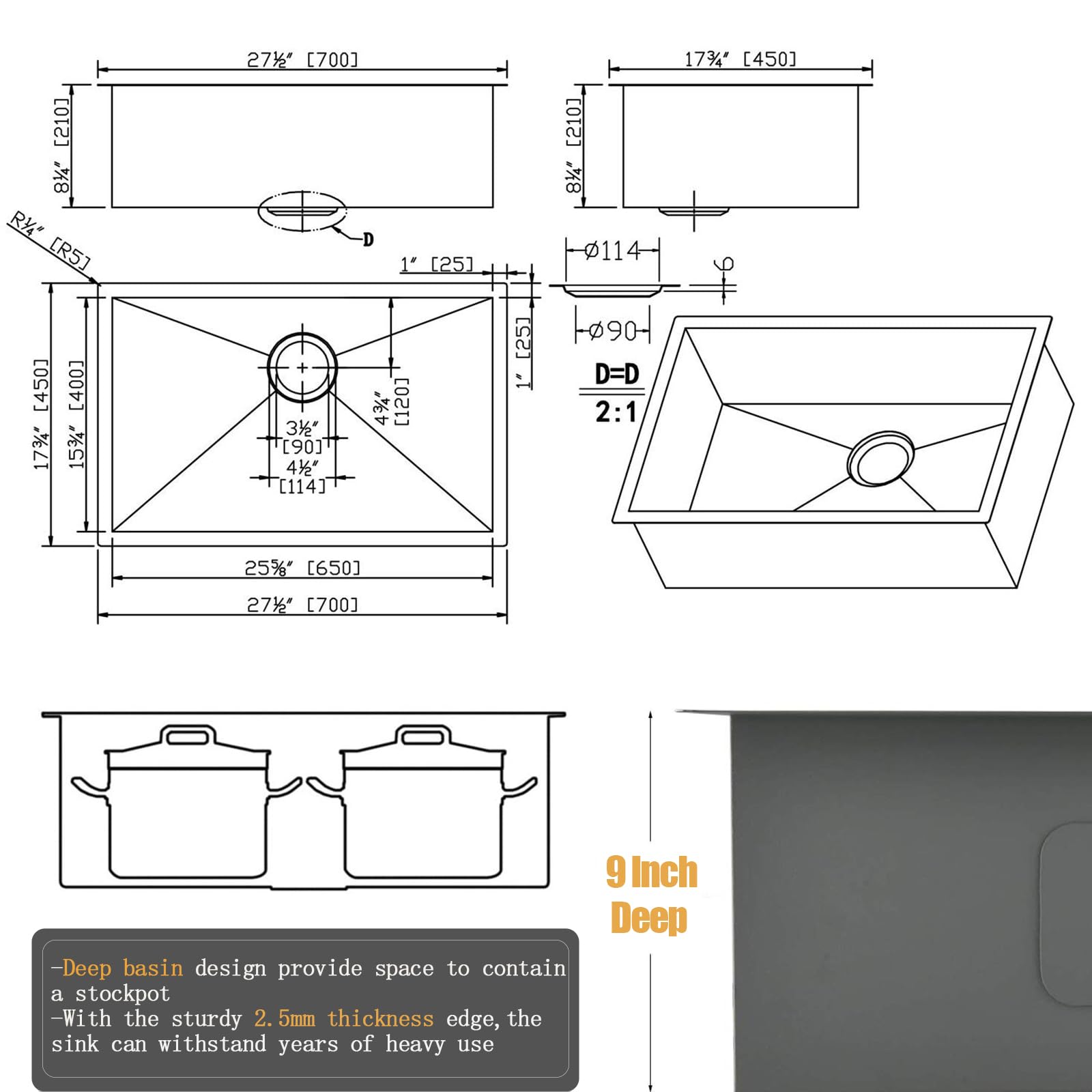 [Kitchen Sink Dimension] - Exterior Dimensions: 28"L x 18"W x 9"D. Interior Dimensions: 26"L x 16"W x 9"D. 9 inches depth to accommodate relatively large bowls. Standard 3-1/2" Drain Opening that fits to the most common garbage. Package Included: black kitchen sink and drain strainer. 9 inch deep bowl can accommodate large cookware and baking utensils.