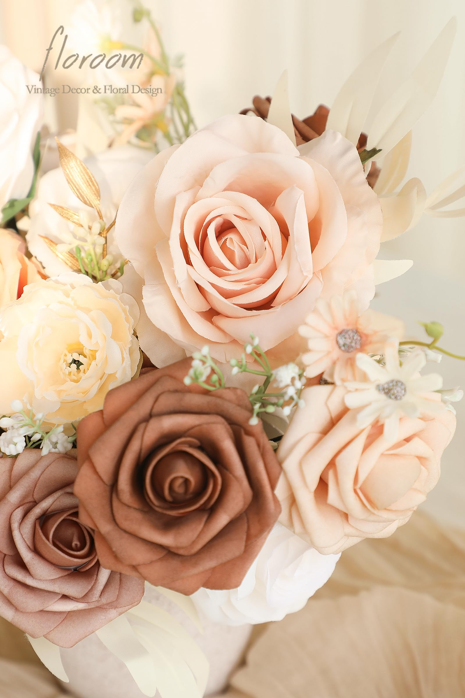 ❤️ Package Details: Includes faux silk flowers with white and champagne peonies, and peach roses; foam flowers feature cream, nude, burnt orange, and peach roses. Also contains willow leaves as accessories.