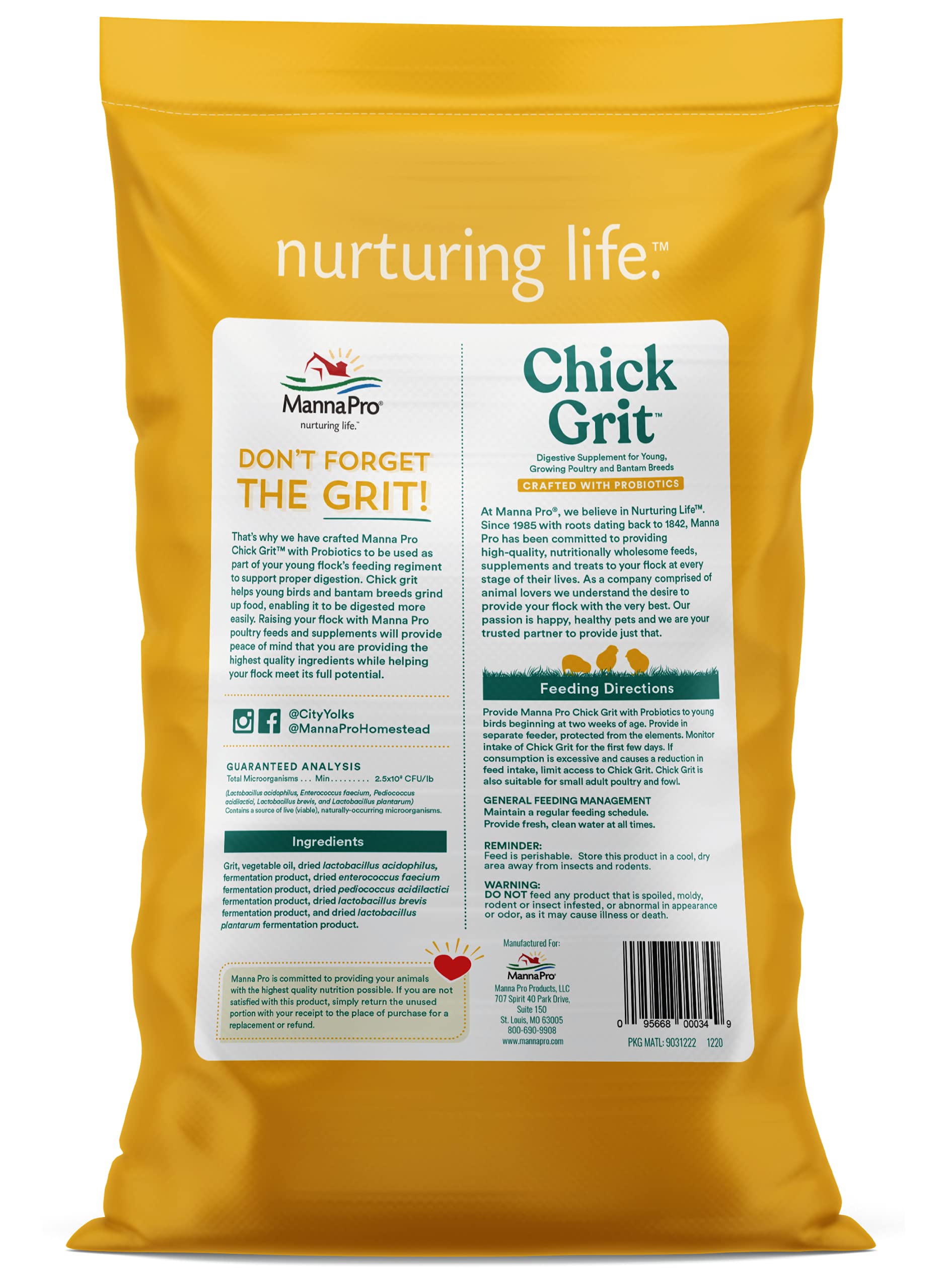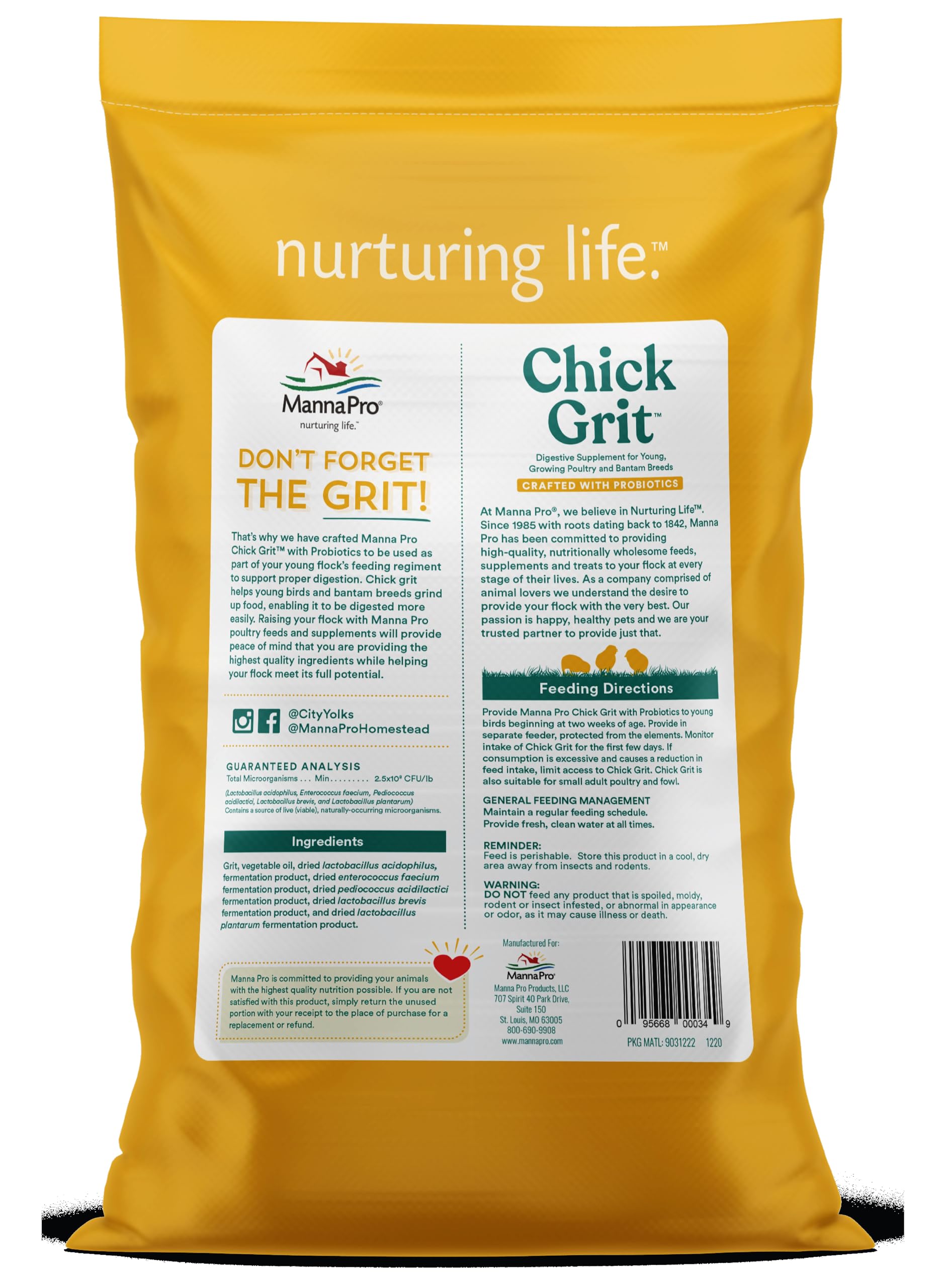 At Manna Pro we believe in Nurturing Life. Since 1985 with roots dating back to 1842, Manna Pro has been committed to providing high-quality, nutritionally wholesome feeds, supplements and treats to your flock at every stage of their lives. As a company comprised of animal lovers we understand the desire to provide your flock with the very best. Our passion is happy, healthy pets and we are your trusted partner to provide just that. That’s why we have crafted Manna Pro Chick Grit with Probiotics to be used as part of your young flock’s feeding regiment to support proper digestion. Chick grit helps young birds and bantam breeds grind up food, enabling it to be digested more easily. Raising your flock with Manna Pro poultry feeds and supplements will provide peace of mind that you are providing the highest quality ingredients while helping your flock meet its full potential.