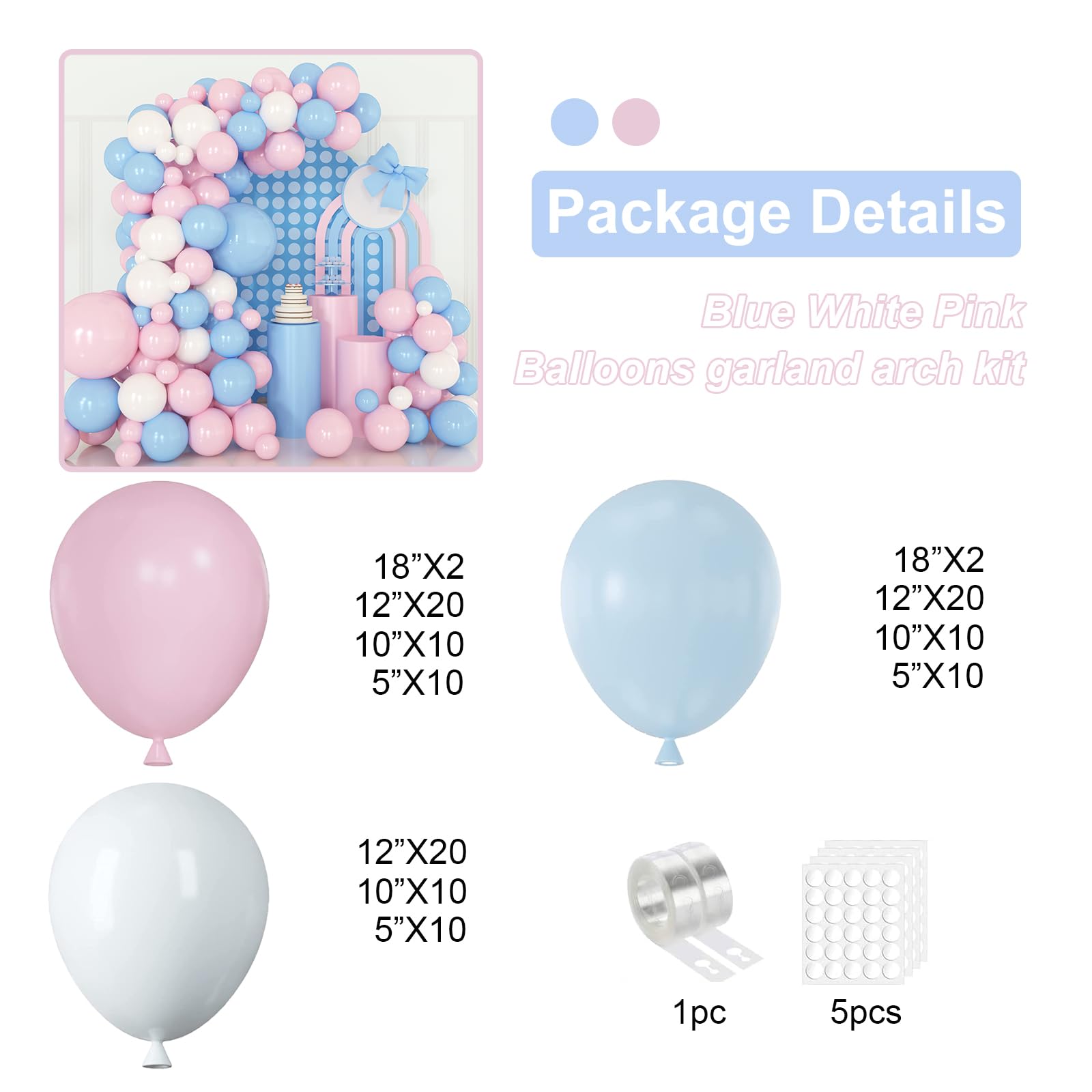 【DIY Balloons Package List】: The pink and blue balloon arch kit come with 124pcs pink white blue balloons, including 4 different sizes: white balloons x 40pcs, light pink balloons x 42pcs, light blue balloons x 42pcs, Balloon garland strip x 1 roll (16 feet) and 100pcs balloon glue dots, The blue and pink balloons backdrop is very beautiful and stylish. You can DIY your pink and blue balloons according to your need.