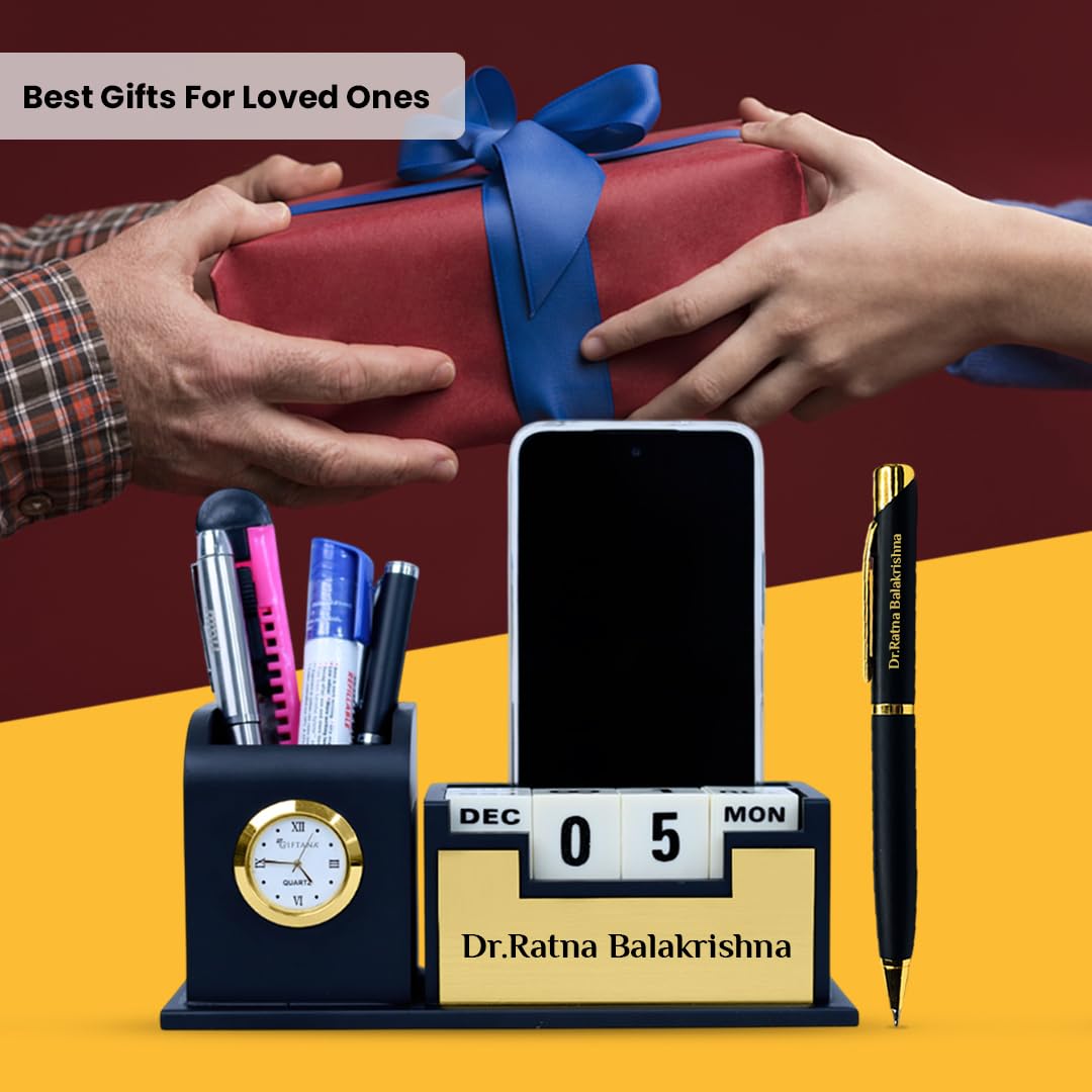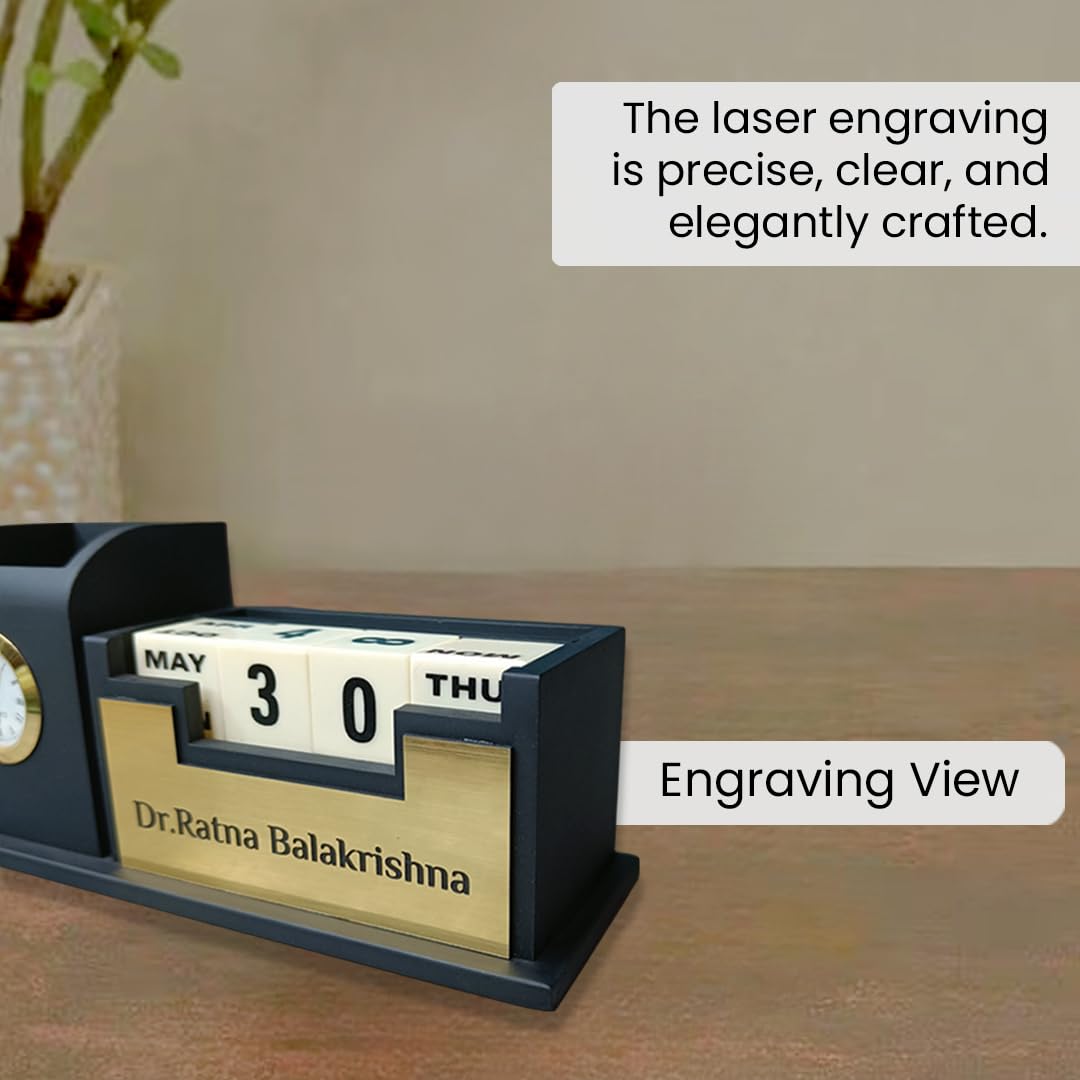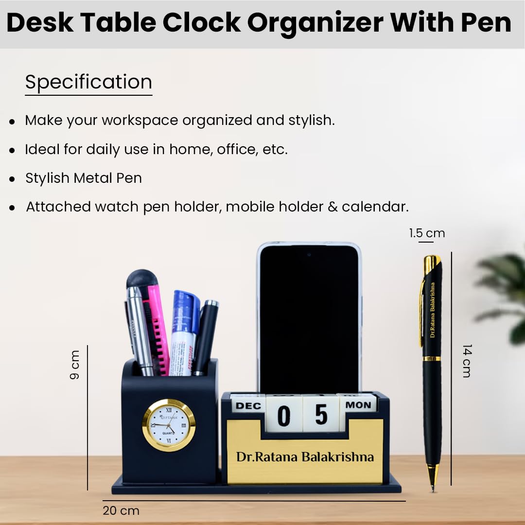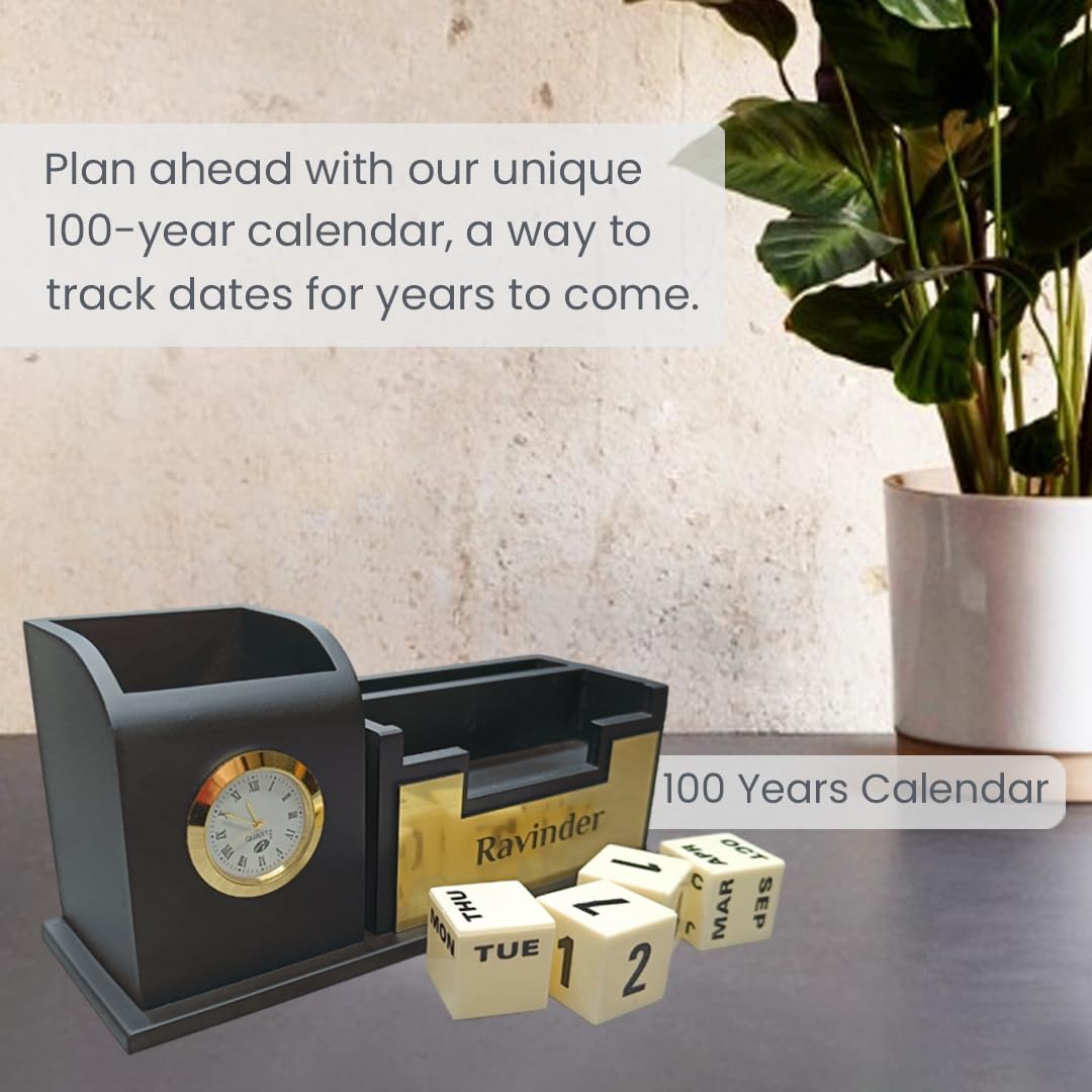 ✔️Desk Organizer : This comprehensive desk organizer integrates a sleek pen stand, card holder, table watch, mobile phone stand, and a 100-year calendar, making it the ultimate accessory for professionals, students, and home offices alike.