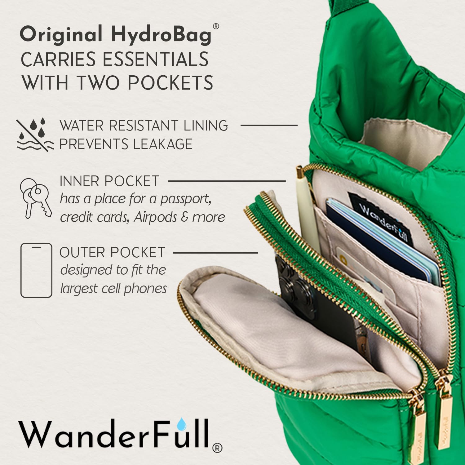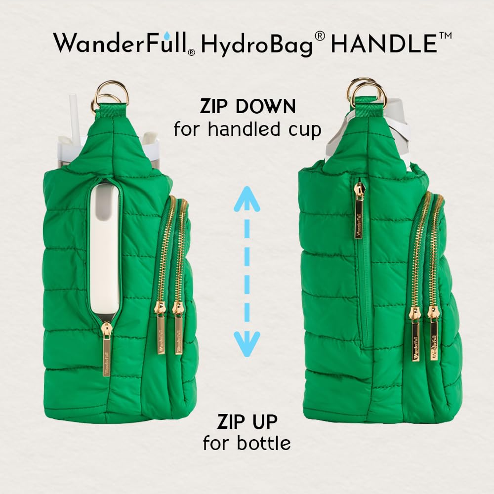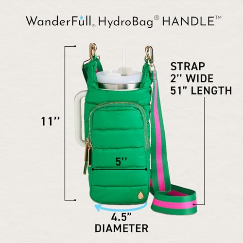 Introducing the patented WanderFull HydroBag Handle - a stylish and practical way to carry your handle tumbler, water bottle, or thermos. Crafted from puffer coat fabric, this bag features an adjustable 2" strap for comfort and flair. You can stay hydrated with ease using the side zipper slot for the handle of your tumbler or bottle. The elastic straw holder prevents leaks and the large double-zippered pockets provide ample storage for essentials, including a spot for your cell phone, passport, and credit cards. Designed for versatility, this bag is ideal for sightseeing, festivals, traveling, and more. The water-resistant pocket protects your items from spills, making it ideal for water bottles, reusable soda cups, coffee cups, and wine bottles. With a height of 11" and a width of 5" (6" at the top), it is larger than our regular HydroBags and fits bottles up to 4.5 inches in diameter. Upgrade your style game with the WanderFull HydroBag Handle Collection and stay hydrated!