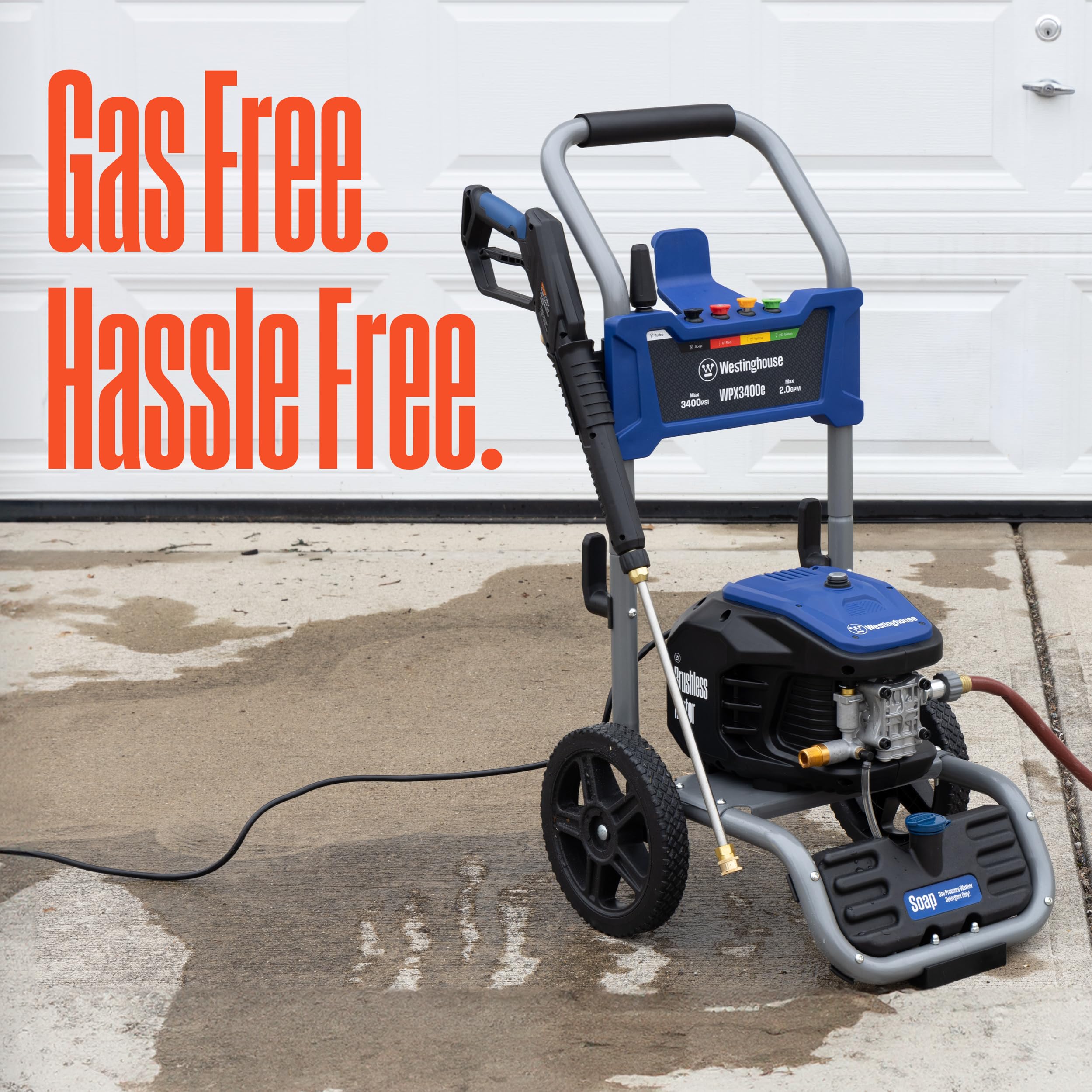 The Westinghouse WPX3400e electric pressure washer delivers a max 3400 PSI and 3000 rated PSI. It provides a max 2 GPM and 1.1 rated GPM of water flow and is designed to tackle your toughest cleaning jobs with the ease of electric. Built with a powerful heavy duty AC 120V true brushless electric engine and a maintenance free axial cam pump, with 5 interchangeable nozzle tips and a built in .45 gallon soap tank, the WPX3400e has the versatility to handle a variety of situations and surfaces including brick, stone, concrete, wood, aluminum and iron. The never flat wheels and 35’ GFCI cord offer easy mobility and maneuverability, allowing you to get into those hard-to-reach places with the toughest grime. Make all your deep-cleaning projects easier than ever before with the Westinghouse WPX3400e pressure washer.