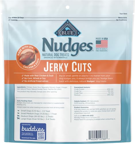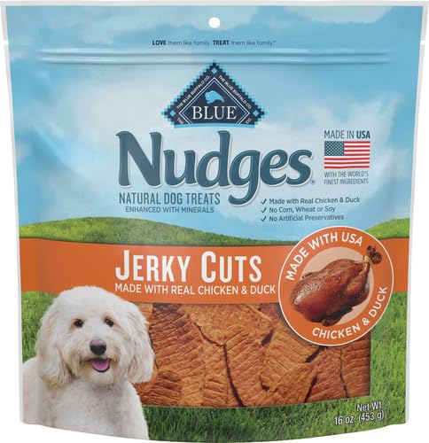 Contains: One (1) 16-oz bag of BLUE Nudges Natural Jerky Cuts Dog Treats, Chicken & Duck Recipe