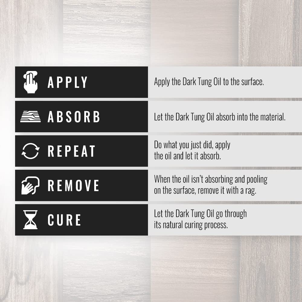100% PURE - Dark Tung Oil for wood finishing. Dark Tung Oil provides a dark matte, and waterproof protective finish. Achieve an aged look on a variety of wooden surfaces