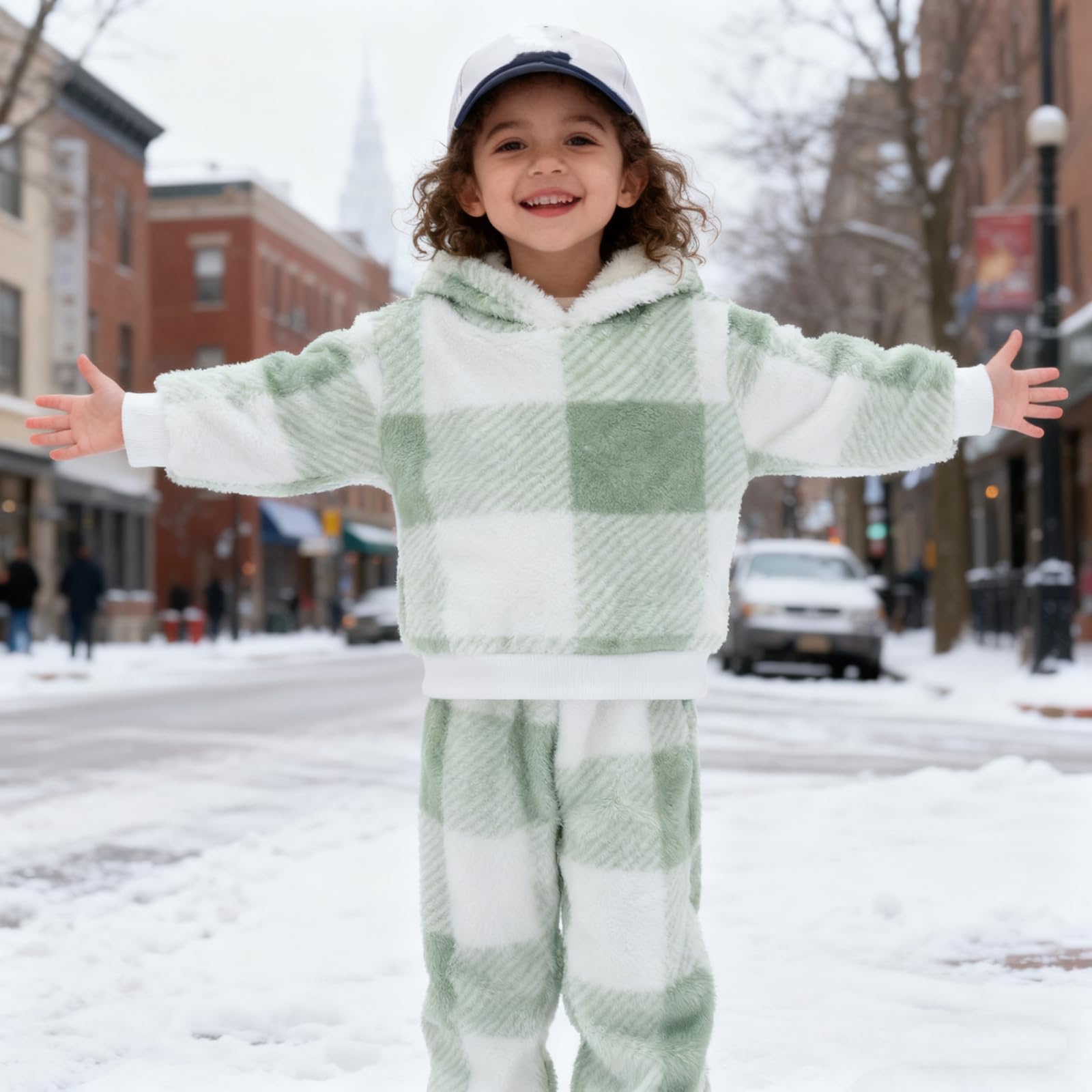 🧦Design --- Flannel Plaid pants sets. The plaid color matching design is very fashionable. Delicate hoodie tops with matching pants with elastic waist. 2 pcs Fall Winter clothes for baby girls.