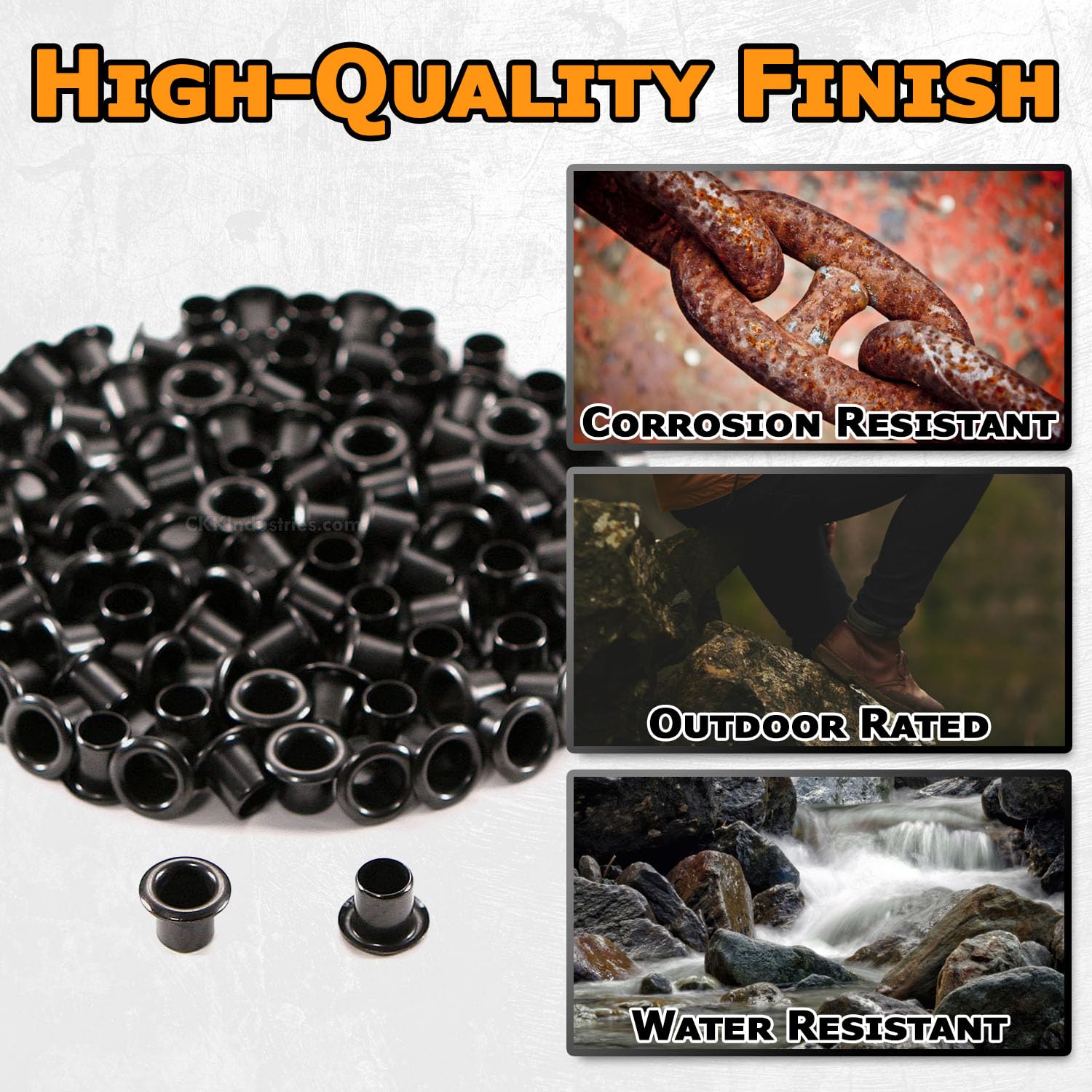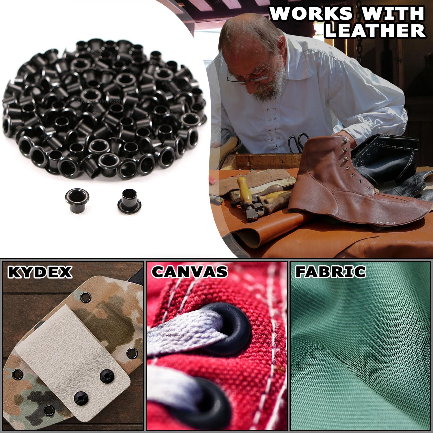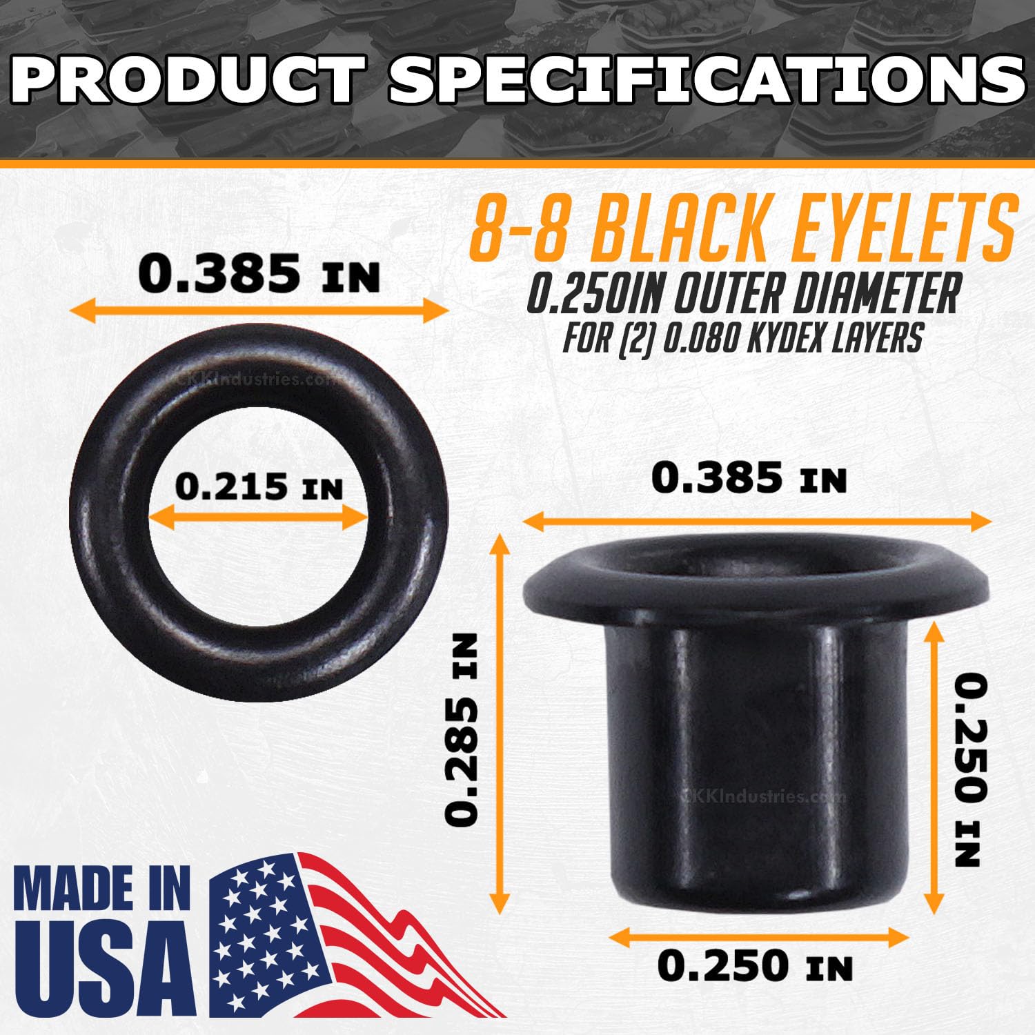 Color/Finish: Black | (#1 Best coating finish in the industry!) | These are the industry standard eyelets (sometimes called binding rivets) that are used in DIY thermoform holster and knife sheath making. They are also commonly used in making leather knife sheaths and gun holsters, and can be used in upholstery and garment manufacturing as well.