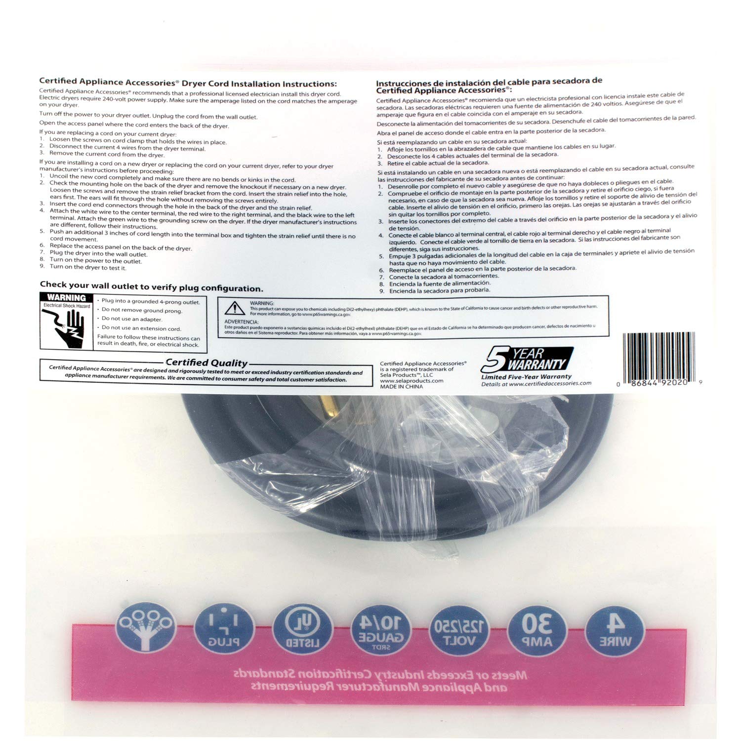 Product Description For years, licensed plumbers, electricians and appliance installers have relied on Certified Appliance Accessories for their power cords, hoses and connectors. Now you can too. Enjoy the convenience offered by this dryer cord from Certified Appliance Accessories. Its flexibility and durability ensure a reliable connection for your next home installation project. This high-quality dryer cord has been thoroughly tested and is backed by a 5-year limited warranty. Follow our illustrated, step-by-step directions included in the packaging. Always consult your appliance’s installation instructions. Check your appliance's manual for the correct specifications to ensure this is the right cord for you. Thank you for choosing Certified Appliance Accessories—Your Appliance Connection Solution. From the Manufacturer 4 foot 4-wire dryer cords are 250V closed eyelet and are UL Listed.