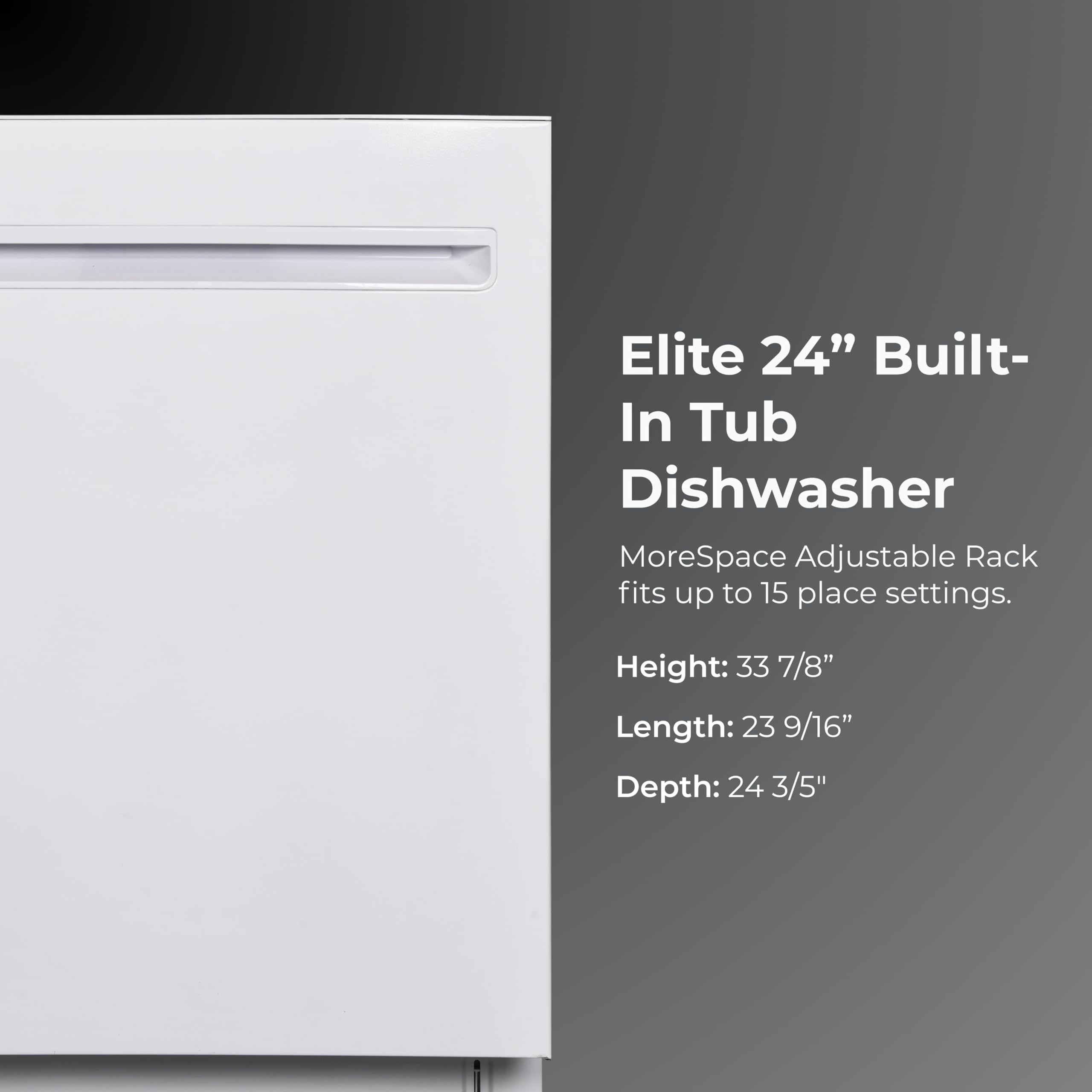 The Kenmore 24" Built-In White Dishwasher delivers ultra-quiet performance and modern design for busy nights and delicate dishes. UltraWash Plus uses three spray arms and filtered water to power through stuck-on food. The SmartWash Cycle detects soil levels in the water and automatically adjusts the temperature, pressure, and cycle time for a deep, efficient clean every time. TurboDry uses hot air circulation and a heating element to remove moisture from every load, while the Extra Dry and Express Cycles give you cabinet-ready results faster. The TurboFlex Third Rack adds 35 percent more loading space for long utensils, tools, and flatware, and slides aside to make room for tall items below. The MoreSpace Plus Adjustable Rack shifts between three heights, even when fully loaded, so you can customize the interior for everything from oversized pots to delicate stemware. The stainless steel tub resists stains and retains heat to help improve drying performance with every cycle. Built-in LED interior lighting makes it easy to see inside, and a green floor light shows when the cycle is running. Hidden light-touch controls and a clean white finish complete the look. This dishwasher fits up to 15 place settings and includes a removable wine glass holder for added peace of mind when washing stemware. ENERGY STAR Certified and operating at just 42 dBA, it offers a powerful clean that runs quietly in the background. Built-in Leak Detection helps protect your home by monitoring water flow and automatically draining if a problem is detected.
