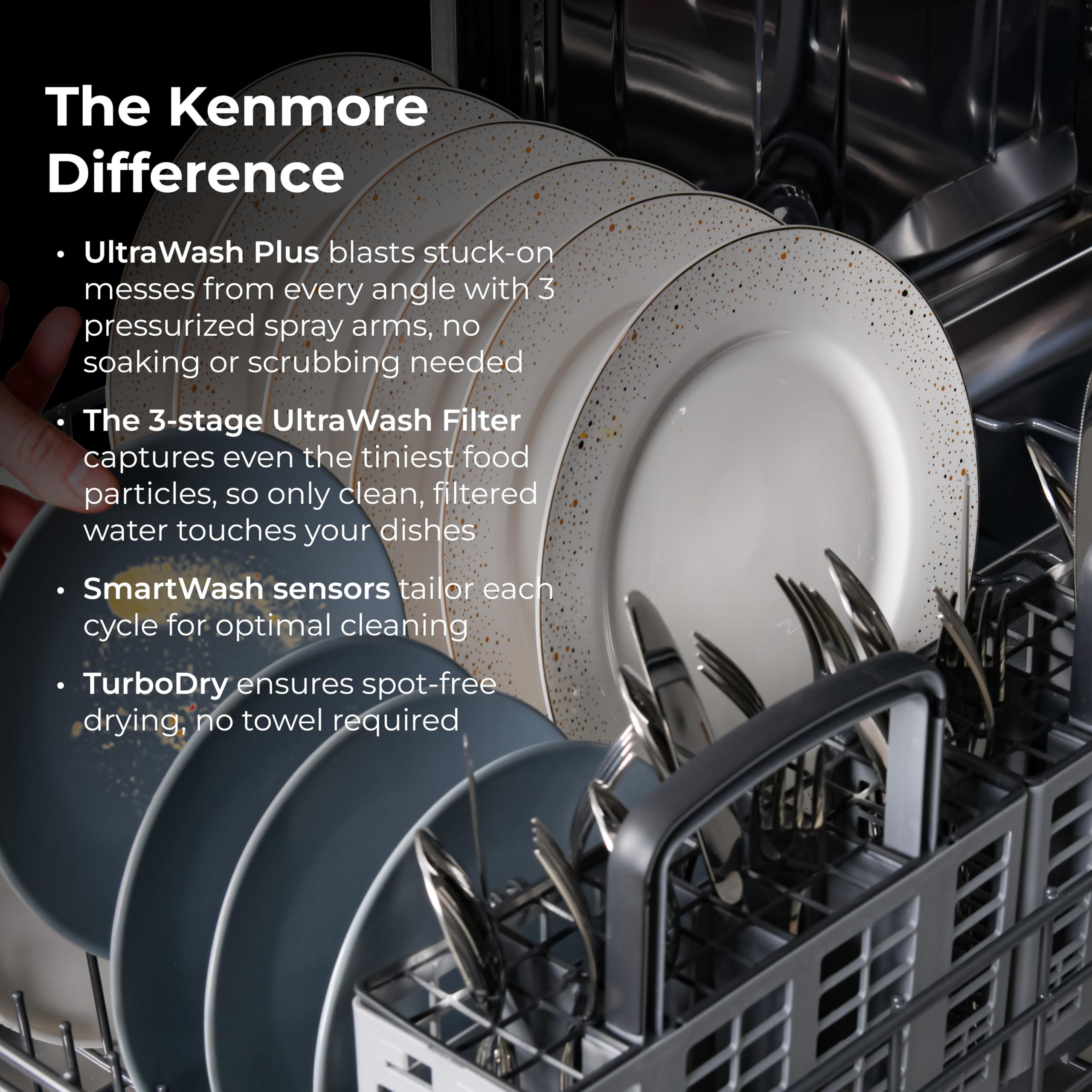 UltraWash Plus Power Cleaning: 3 pressurized spray arms clean dishes from every angle using fresh, filtered water. Accela Wash option cleans dishes if you're in a hurry. Sani Rinse option gets dishes seriously clean