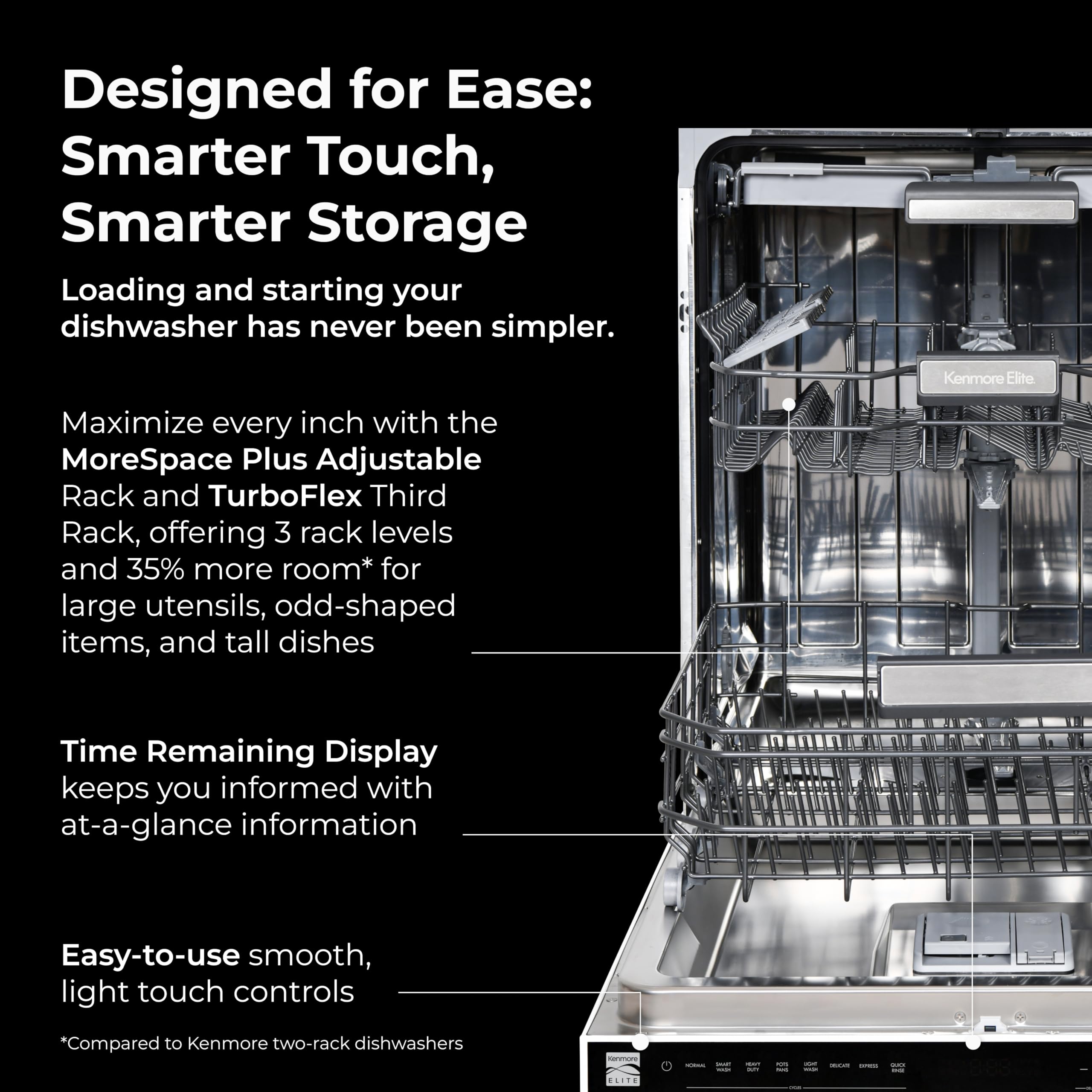 TurboFlex Third Rack plus Adjustable Interior: Get 35% more loading space for large utensils with the removable TurboFlex third rack. Need more height. Slide the trays aside to fit tall items in the middle rack. MoreSpace Plus Upper Rack adjusts to 3 heights
