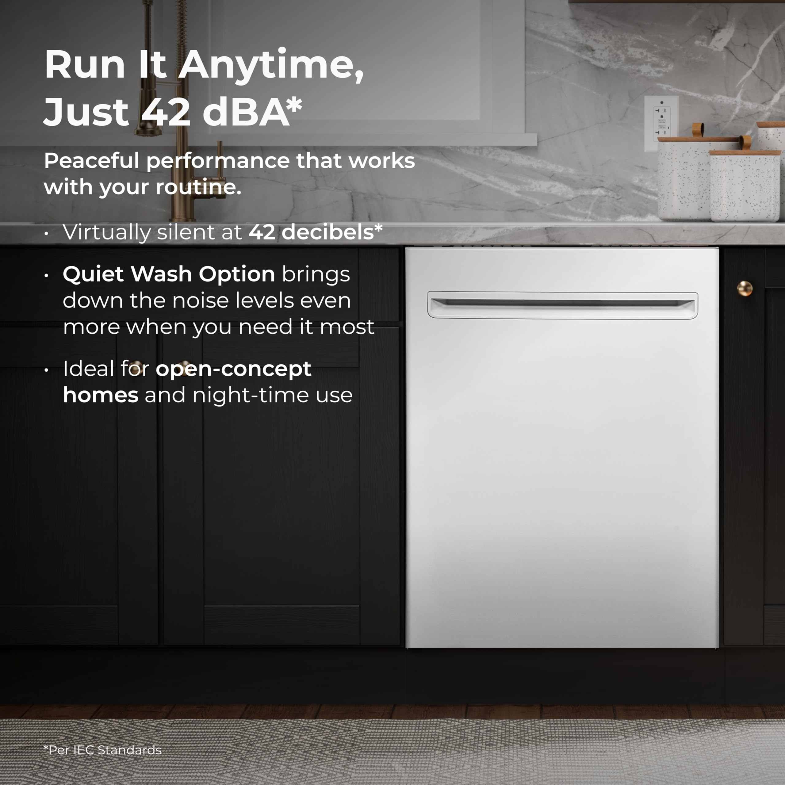 Whisper-Quiet Wash plus Smart Features: This elite dishwasher runs at just 42 dBA with a QuietWash option for a whisper quiet cycle. LED floor light tells you when it's running. Hidden touch controls and a sleek bar handle offer a streamlined look