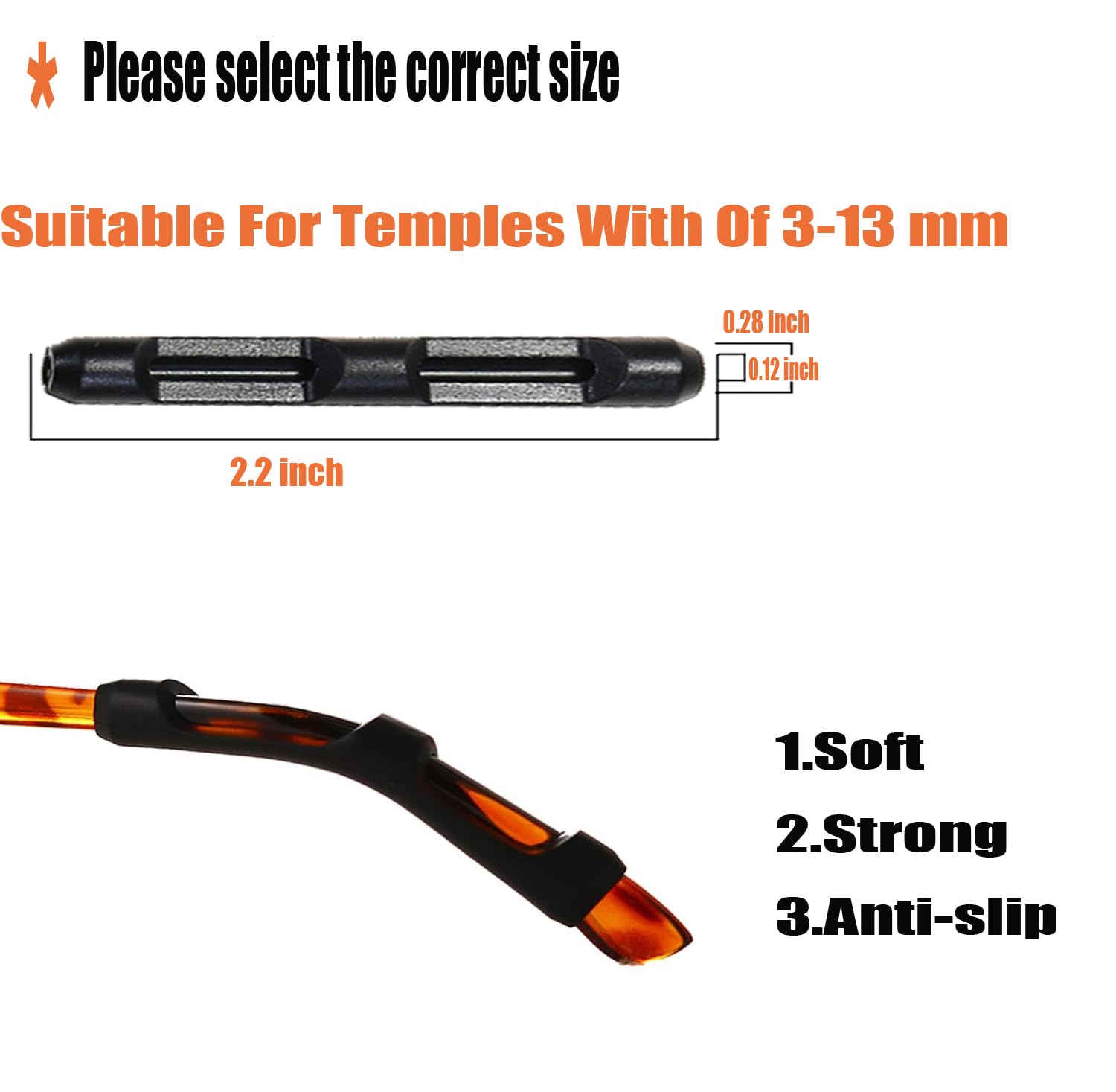 Size: 2.2in x 0.3in, Hole diameter: 0.1in (suit for the glasses legs from 0.1in to 0.4in in width)