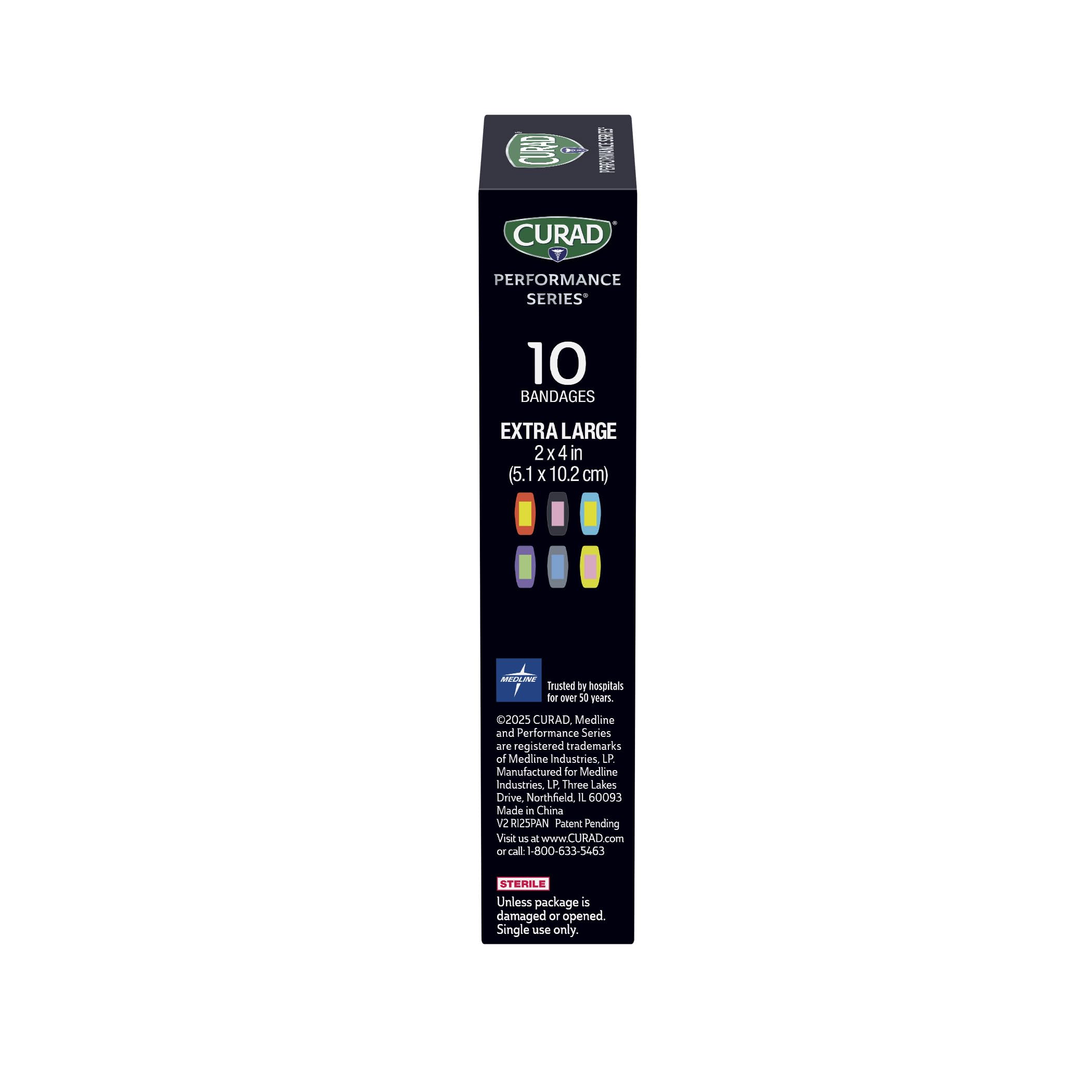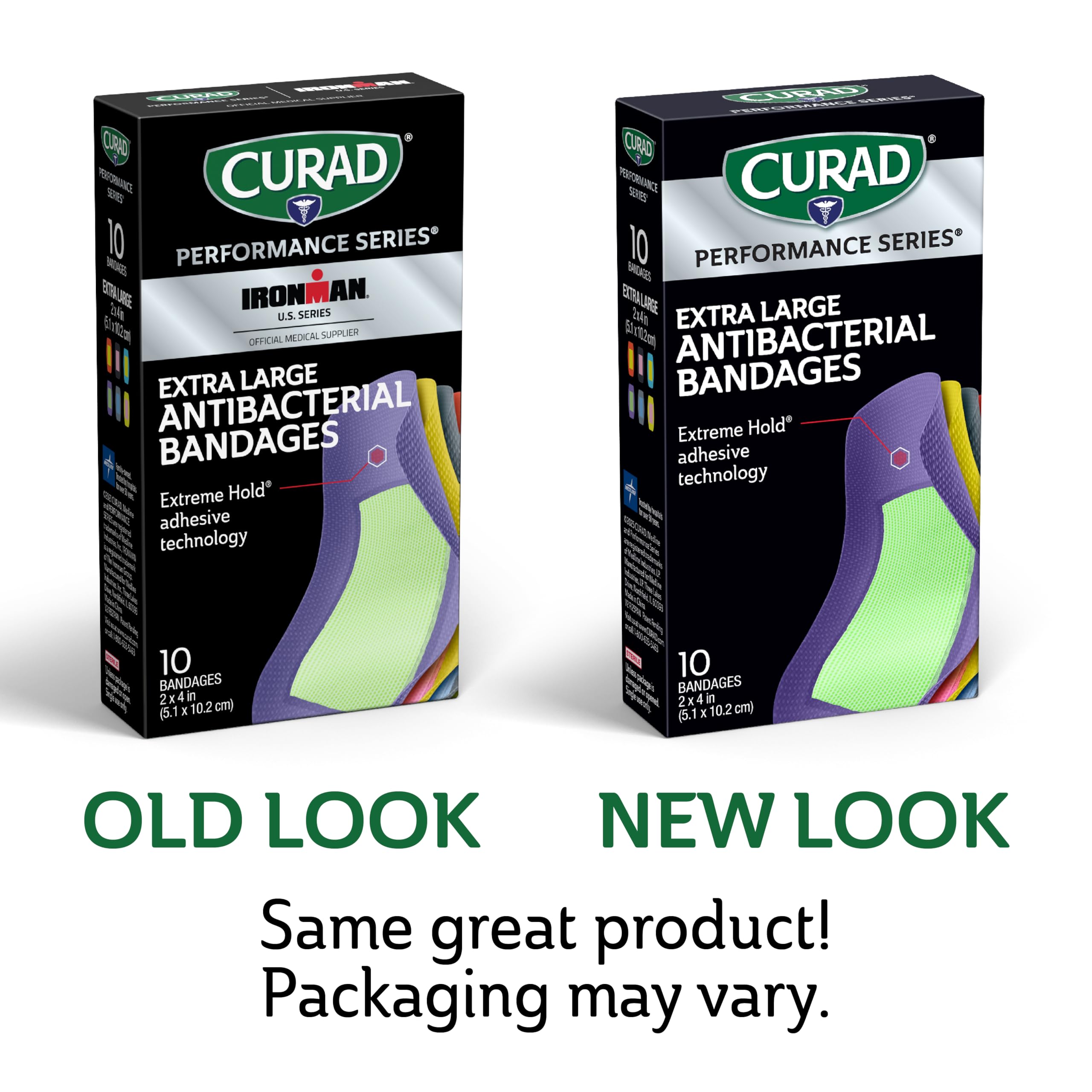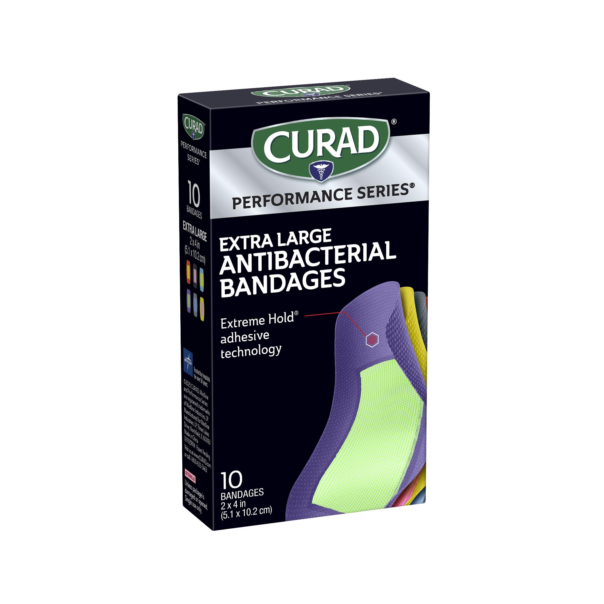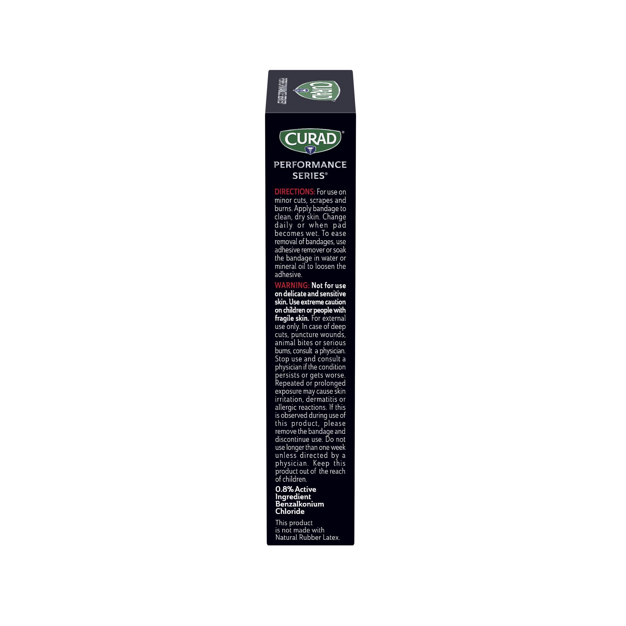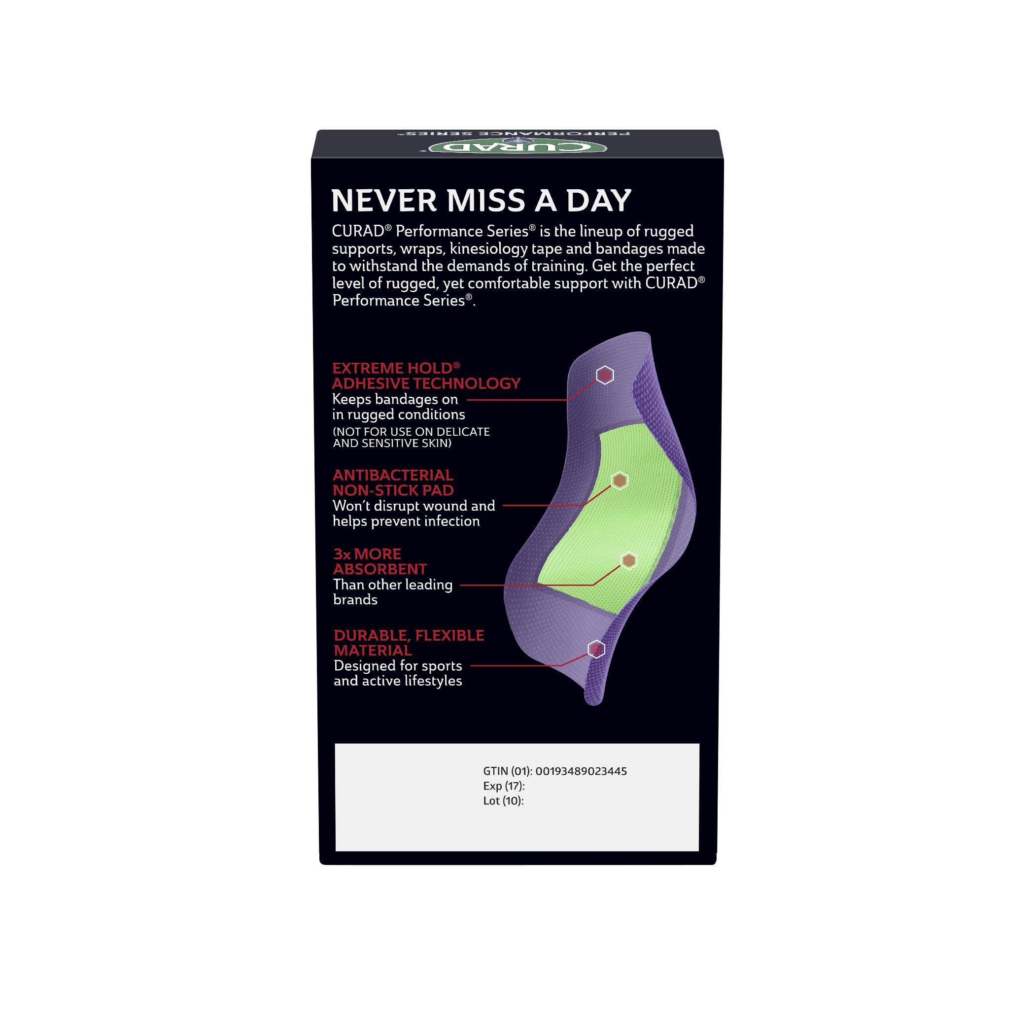 CURAD Performance Series presents Antibacterial Bandages, fortified with cutting-edge Extreme Hold adhesive technology for unwavering support. Engineered for endurance, these bandages are crafted with durable, heavy-duty fabric, offering outstanding protection suited for active individuals engaged in sports and rigorous activities. Featuring an antibacterial non-stick pad containing 0.8% Benzalkonium Chloride, these bandages help prevent infection while ensuring wound comfort without disruption. The rugged woven fabric is not only tough but also flexible, conforming to the body's movements for unparalleled comfort. Compared to other leading brands, the Performance Series bandages offer an impressive 3X more absorbency. Designed to endure the toughest workouts and competitions, these bandages stay put through rain, mud, and relentless movement. The CURAD Performance Series Antibacterial Bandages prioritize comfort, dirt protection, and germ resistance, ensuring unwavering support when faced with challenges. *Not for use on delicate and sensitive skin.