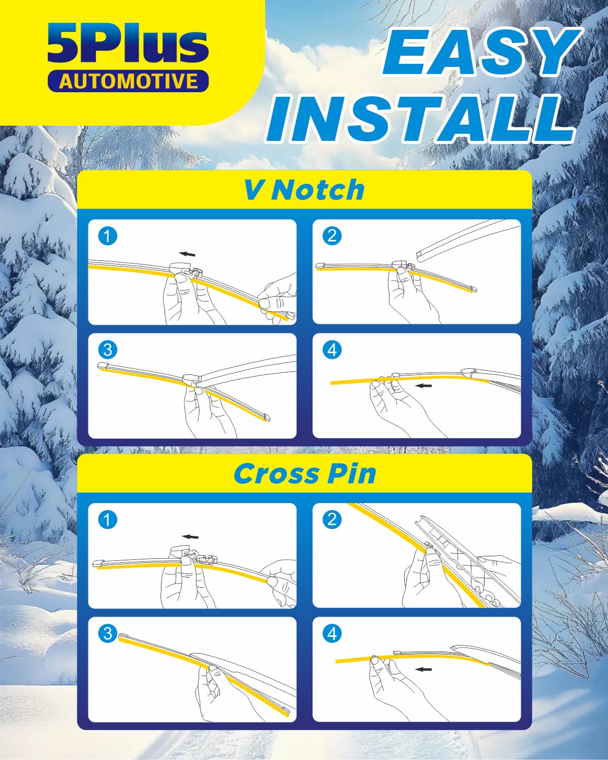 【Durable】- The use of 5 Plus newly developed synthetic rubber to enhance the double life of the wiper, which can maintain better use effect in high temperature and cold weather. Exceed OEM quality standards.