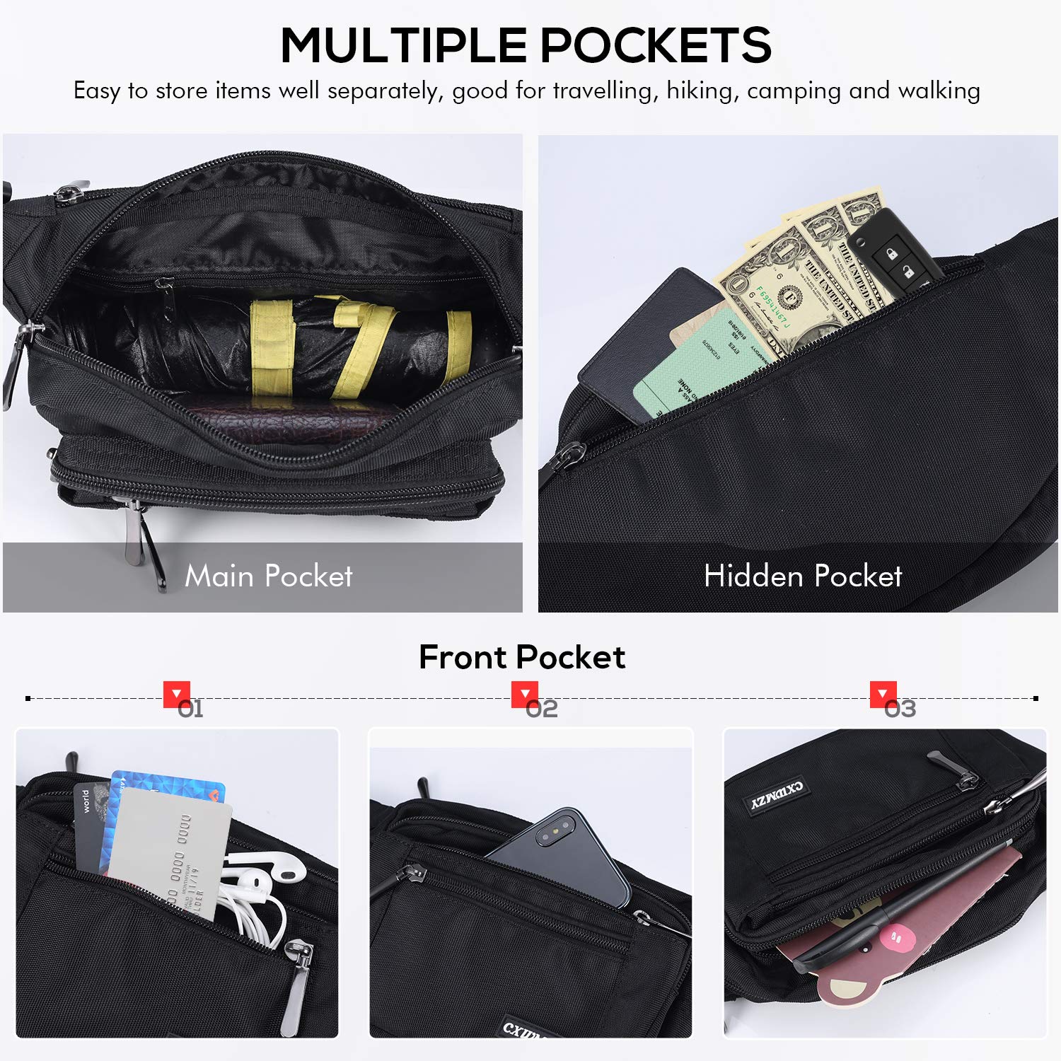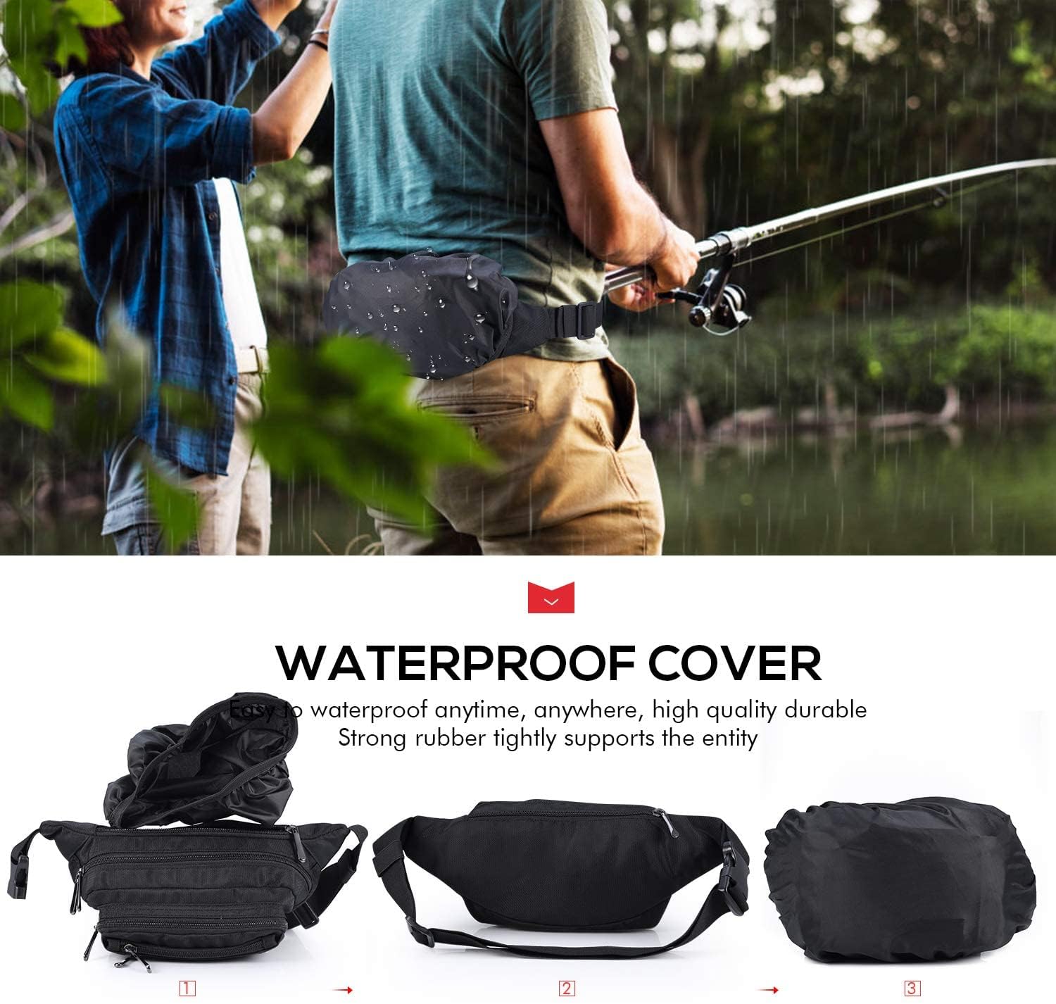 【6 MULTI-POCKET DESIGN】Our fanny packs for women & men will keep your hands & pockets free! 5 zipper pockets of different sizes and a hidden zipper pocket design, hidden zip perfect give your valuables extra security, all your needs. The largest pocket can easily accommodate a standard water bottle. A zippered exterior pocket located behind the waist band with Rain Cover it can better protect important items in rainy days.