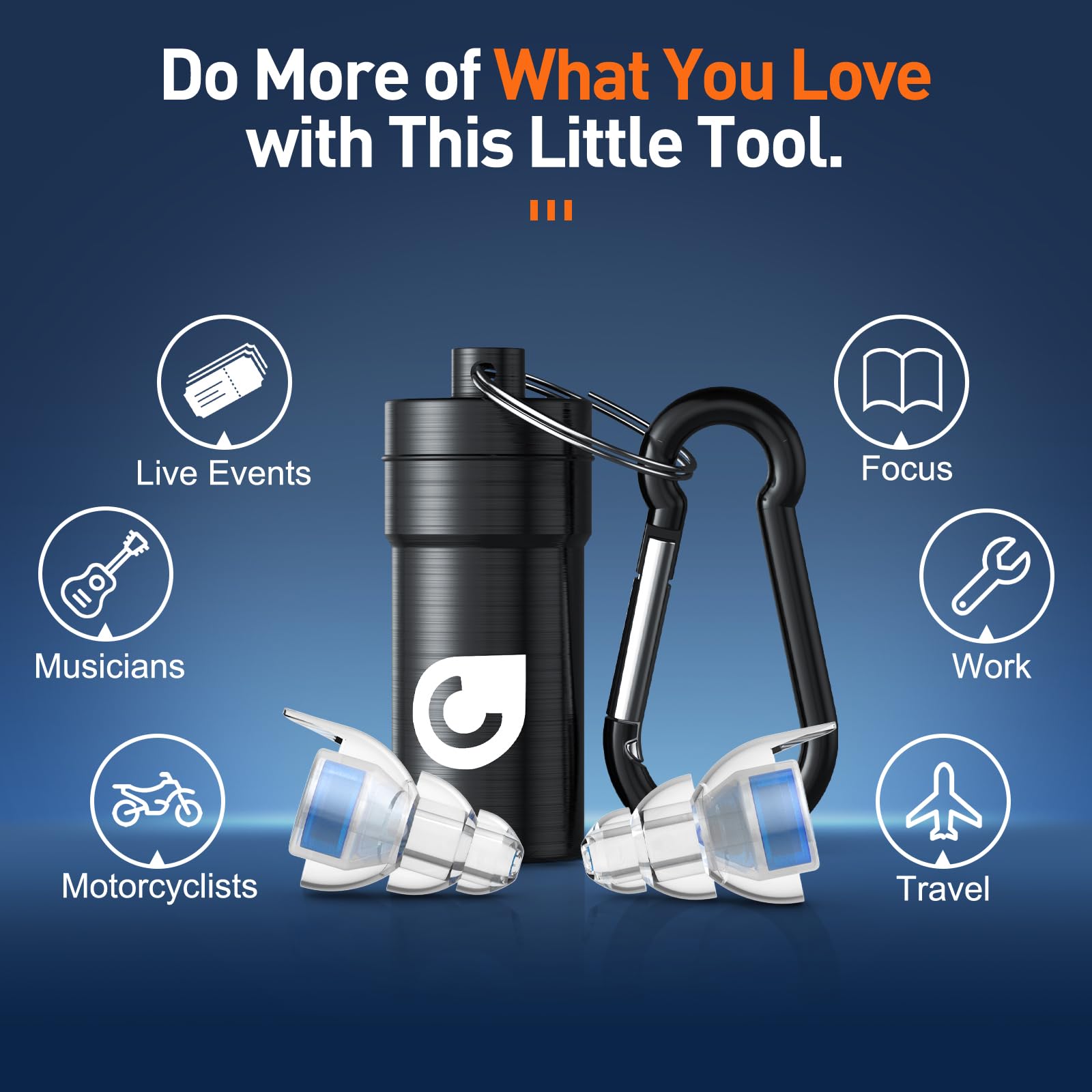REURE CAN PROTECT YOU ANYWHERE - The compact aluminum case with rubber seal is waterproof and dustproof. You can carabiner it on your key chain, jeans, or backpack and it can follow you anywhere. Ideal for concerts, noise sensitivity, tinnitus relief, motorcycles, musicians, sports events, flying, sleeping noise cancelling, etc.
