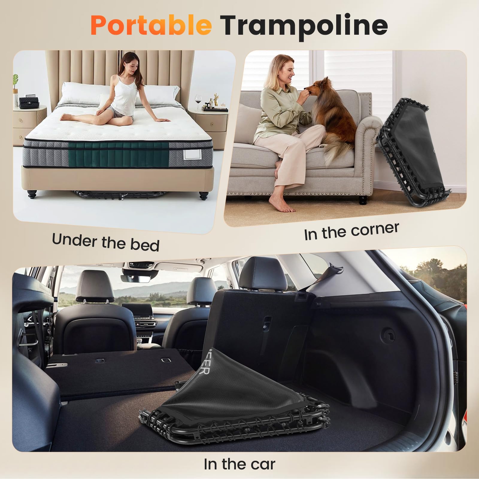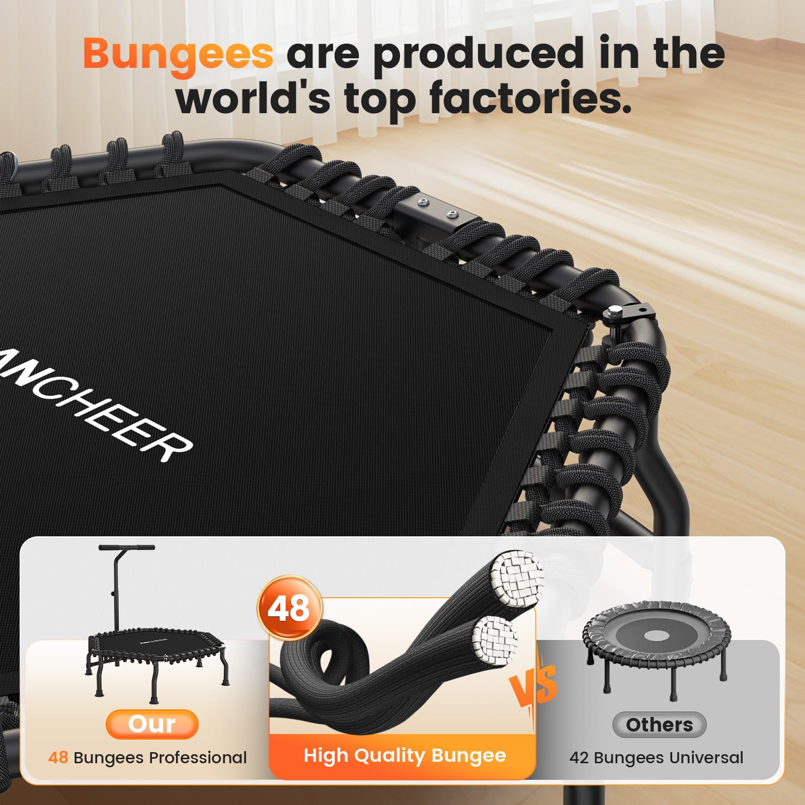 【 Pro-Grade Bungee System & Silent Bounce】48 heavy-duty elastic cords replace noisy springs, delivering 30% higher vertical bounce (vs. basic models) while reducing joint impact – ideal for postpartum recovery and arthritis-friendly cardio.