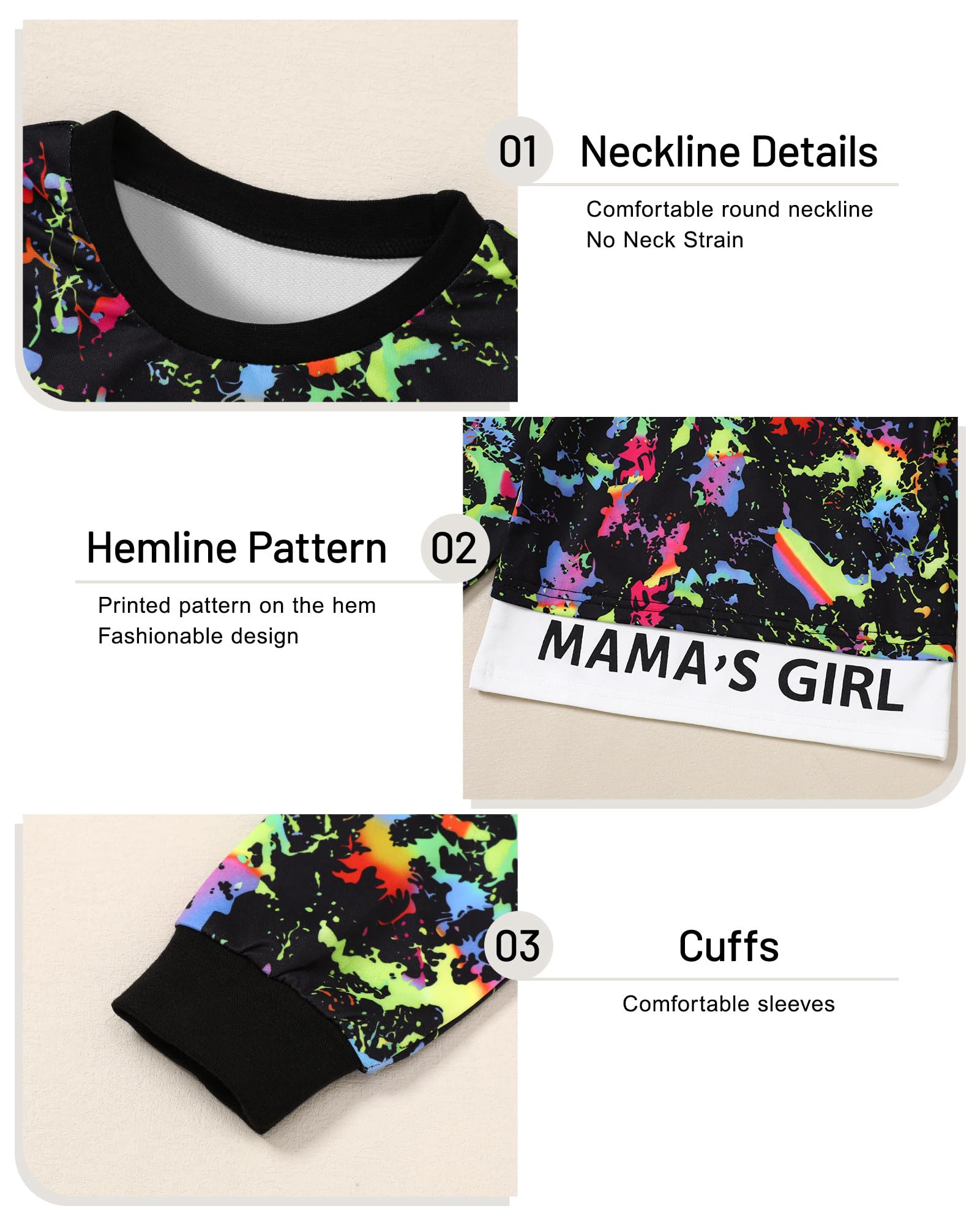 7 Sizes Available - 12-18 month baby girl outfits,18-24 month Toddler girl clothes, 2-3t long sleeve sweatshirt,3-4t toddler girl outfits,4-5 year old toddler girls clothing, 5-6 years old girls clothes,6-7 years girls outfits, kids toddler baby girl pants outfits.Please carefully check the ruler before ordering.