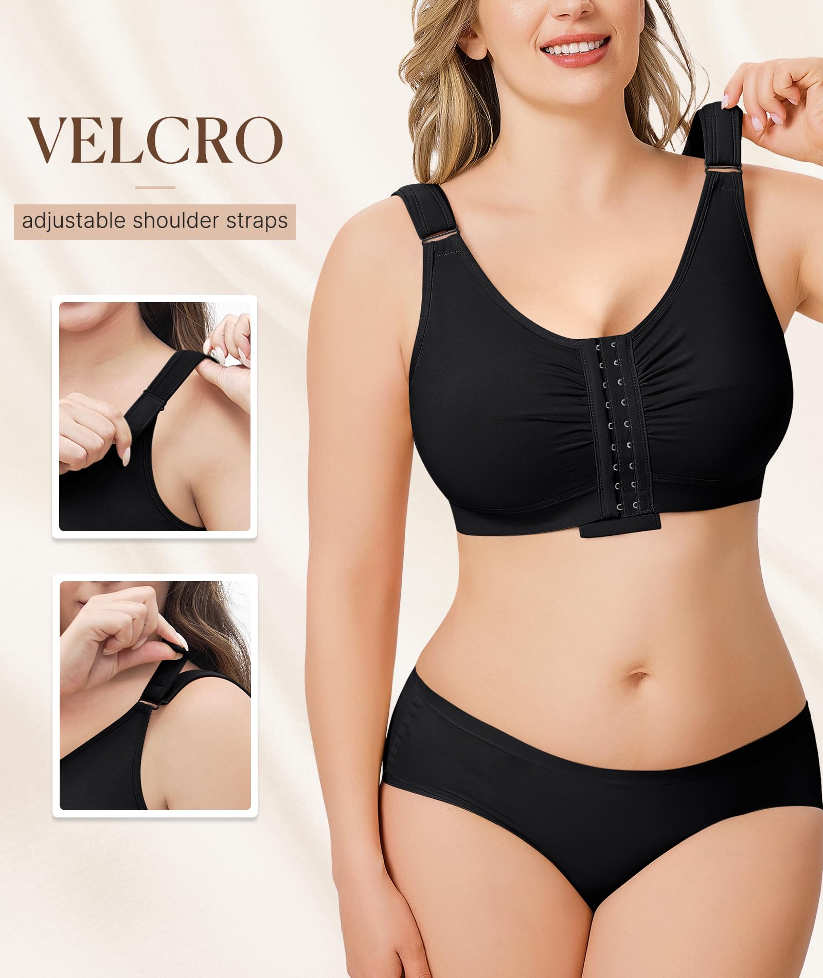 【Front Closure & Adjustable Straps】Designed with a "hook and eye" front closure and wide shoulder straps, post surgery bras for women front closure enhances compression. The adjustable straps allow for flexible tension control based on individual needs. The front closure hook & eye design also makes it easier to put on and take off during postoperative check-ups, minimizing discomfort caused by arm lifting. Wide straps help distribute shoulder pressure evenly.