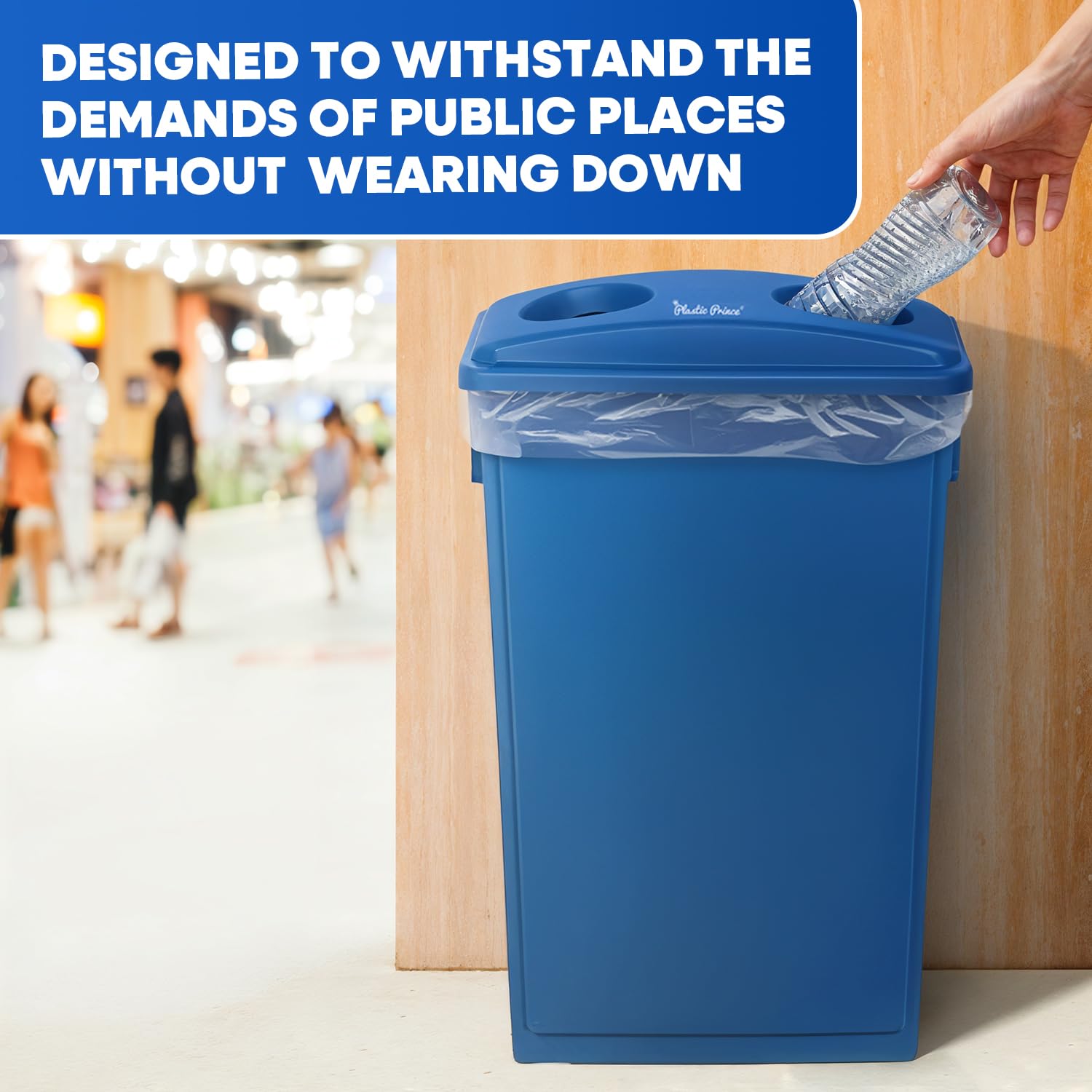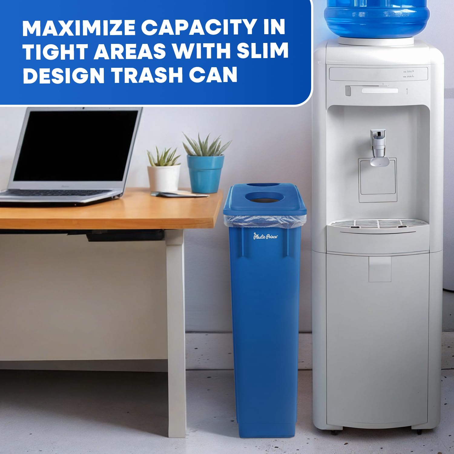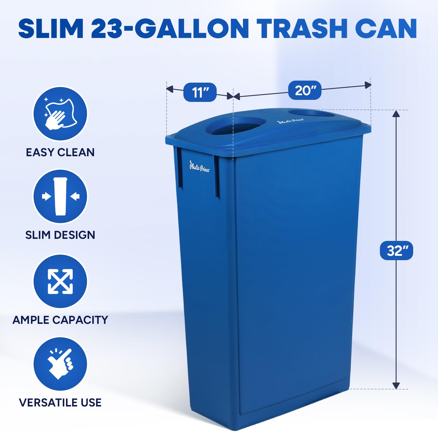 Slim 23-Gallon Trash Can: This tall, space-saving recycling bin fits easily in tight areas like kitchens, under cabinets, offices, or commercial spaces, offering a slim design that maximizes capacity without taking up unnecessary room. Ideal for efficient waste management.