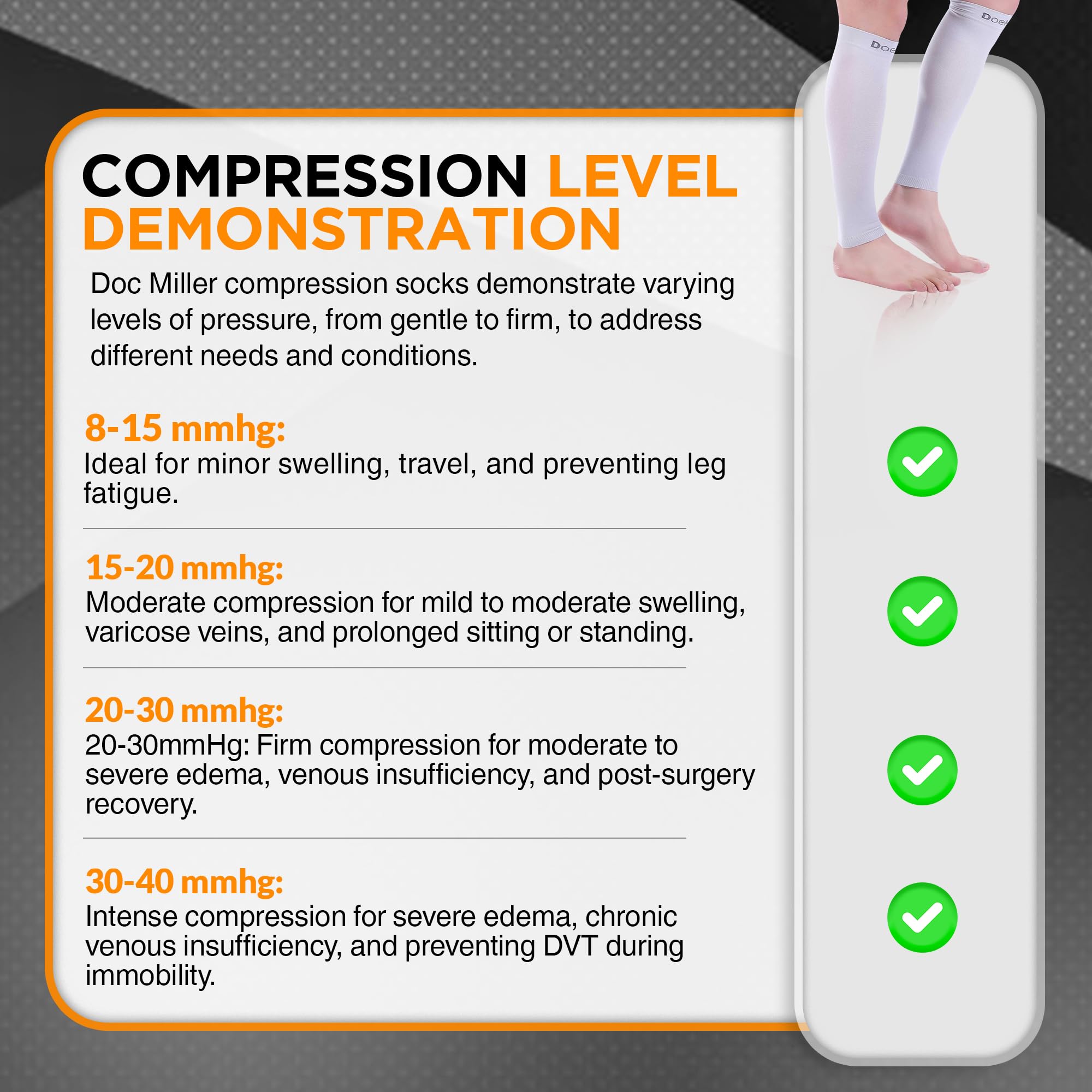 20-30 mmHg Compression Level: Offers firm, graduated compression for comfortable leg support. Ideal for use during long periods of standing, walking, or light activity.
