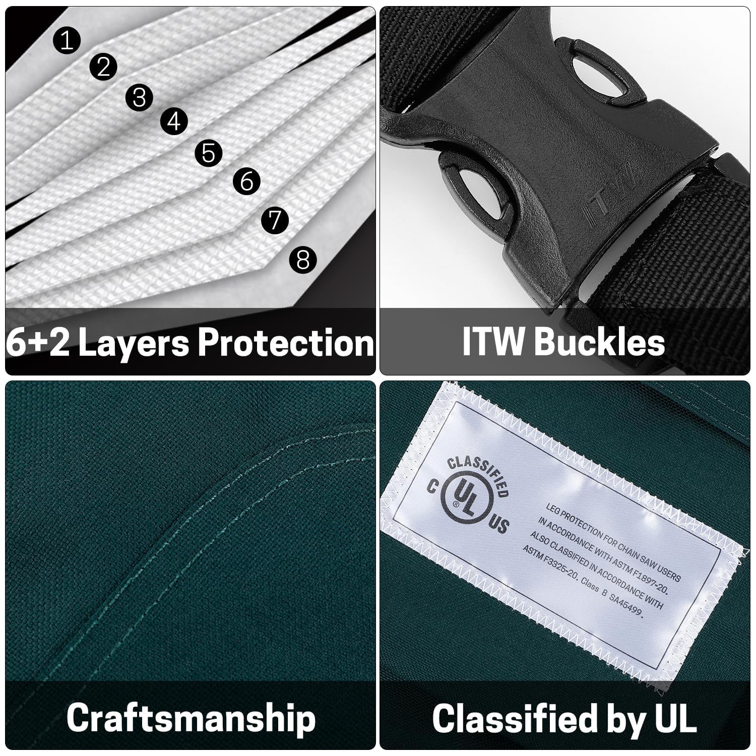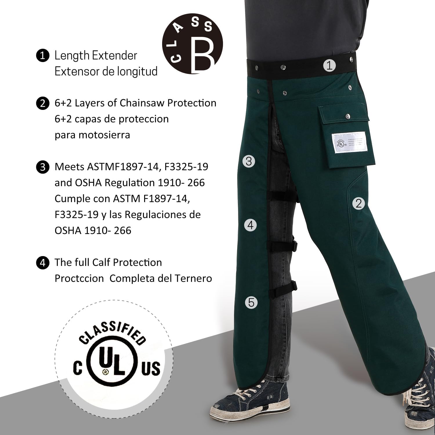 Certification: The chainsaw chaps are certified by Underwriters Laboratories(UL), meet ASTM F3325-19 and ASTM F1897-14 for USA, meet OSHA Regulation 1910-266, Meet ANSI Z133.1.