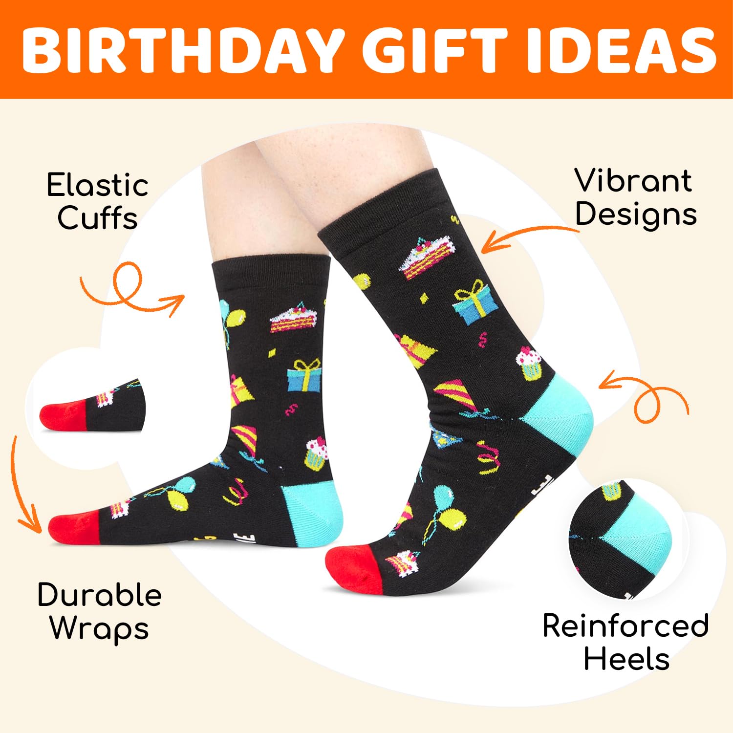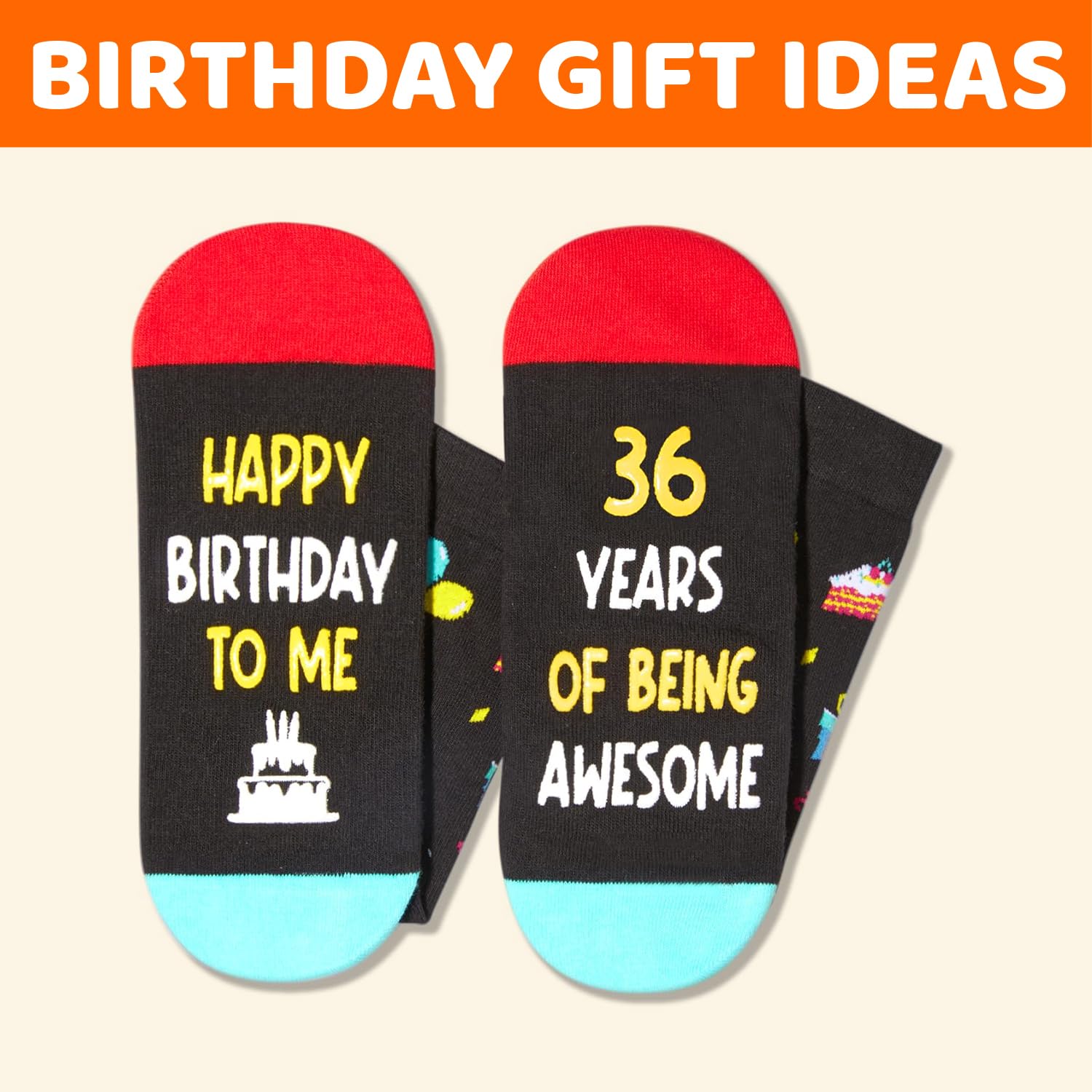 36TH BIRTHDAY GIFT IDEAS: Celebrate a 36th birthday in style with our uniquely designed socks, adorned with festive elements like birthday balloons, presents, hats, and cakes. The bottom reveals a playful secret message in non-slip ink: "HAPPY BIRTHDAY TO ME, 36 YEARS OF BEING AWESOME."