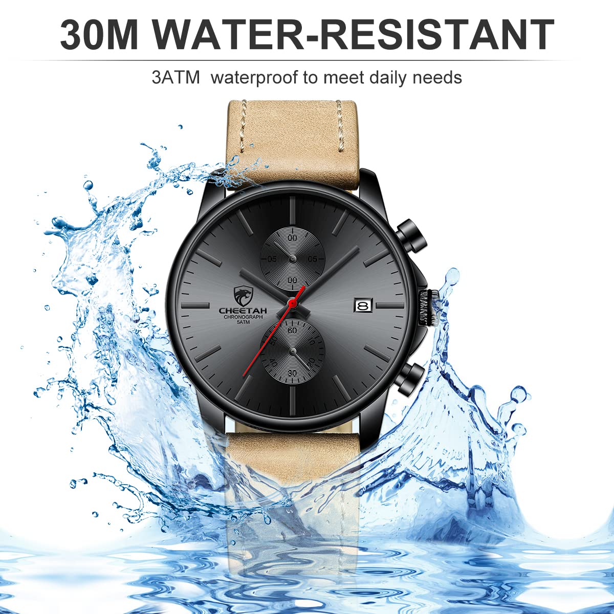 ⌚3ATM waterproof: This watch is waterproof 30m, can withstand daily splash or short immersion in water, but not swimming and showering, diving or snorkeling.