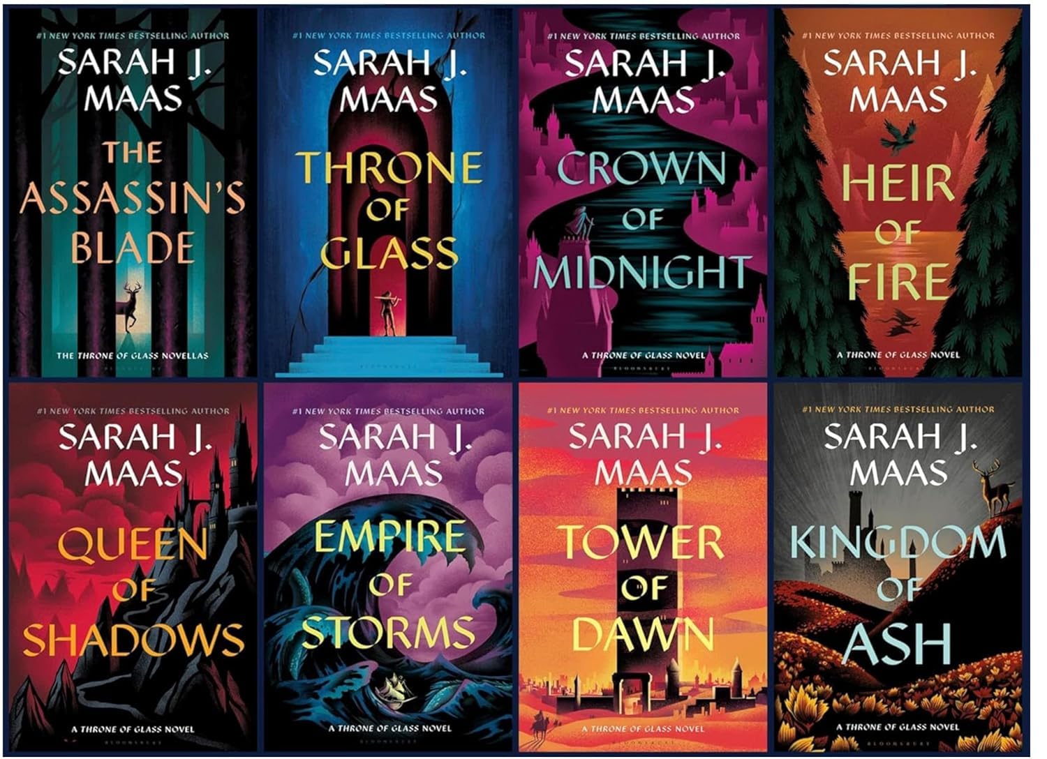 Enter a world of assassins, ancient magic, forbidden power, and unforgettable heroes with the Throne of Glass Series 8-Book Box Set by #1 New York Times bestselling author Sarah J. Maas. This epic fantasy saga follows the journey of Celaena Sardothien, a fierce young assassin with a dangerous past and an even greater destiny. As war brews and dark forces rise, Celaena must navigate court intrigue, hidden truths, and the weight of a fate she never expected. This complete collection includes all seven main novels and one prequel novella compilation—making it the ultimate gift for fantasy lovers and the perfect addition to any young adult library. Included in the Set: The Assassin’s Blade (Prequel) Discover Celaena before the legend begins. This collection of five thrilling novellas reveals her early missions, loyalties, betrayals, and the events that led to her imprisonment in the salt mines of Endovier. A gripping introduction to her complex past. Throne of Glass Freed from prison by the Crown Prince, Celaena is offered a deadly bargain: compete to become the King’s Champion in exchange for her freedom. But the palace holds dark secrets, and winning the competition might cost her more than her life. Crown of Midnight Now the King’s Champion, Celaena follows his orders while secretly working against him. As deadly truths are revealed and loyalties are tested, she must choose between justice and survival. Heir of Fire Celaena journeys to a distant land to uncover her magical heritage and train under a powerful Fae warrior, Rowan. As evil stirs across the continent, she must find the strength to rise as a queen—and as a warrior. Queen of Shadows Armed with her true identity, Aelin Galathynius returns to Adarlan to reclaim her throne and free her people. But her enemies are powerful, and old scars run deep. Victory will require everything she’s learned—and more. Empire of Storms With war on the horizon, Aelin sets out to unite her allies before darkness consumes the realm. As ancient forces rise, the line between friend and enemy blurs, and devastating sacrifices must be made. Tower of Dawn A companion novel that follows Chaol Westfall’s journey to the Southern Continent in search of healing and new allies. There, he discovers shocking truths that may change the fate of the entire war. Kingdom of Ash The stunning series finale. As Aelin endures unimaginable trials, her friends wage a war to save Erilea. With everything on the line, courage, love, and sacrifice will decide the fate of the world.
