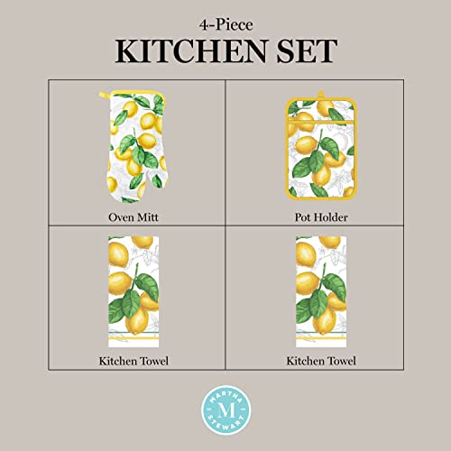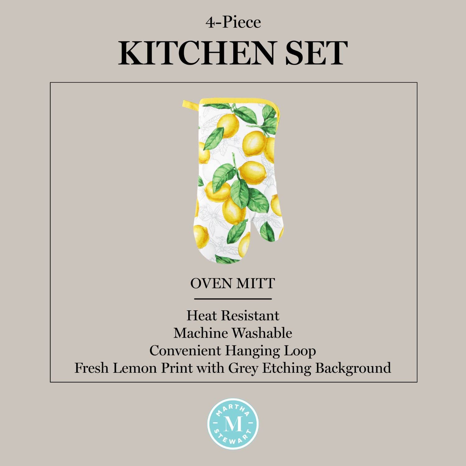 Add style and function to your kitchen décor with the Martha Stewart Lots of Lemons Kitchen Towel, Oven Mitt, and Pot Holder 4-Pack Set. This kitchen essentials set includes two dual-purpose kitchen towels, a coordinating pot holder, and matching oven mitt with the vibrant Lots of Lemons print. This 4-pack set is made of 100% Cotton and features absorbent kitchen towels and heat resistant pot holder and oven mitt. This Martha Stewart kitchen set is the perfect gift for the holidays or as a thoughtful housewarming gift. Each item is machine washable for easy care.
