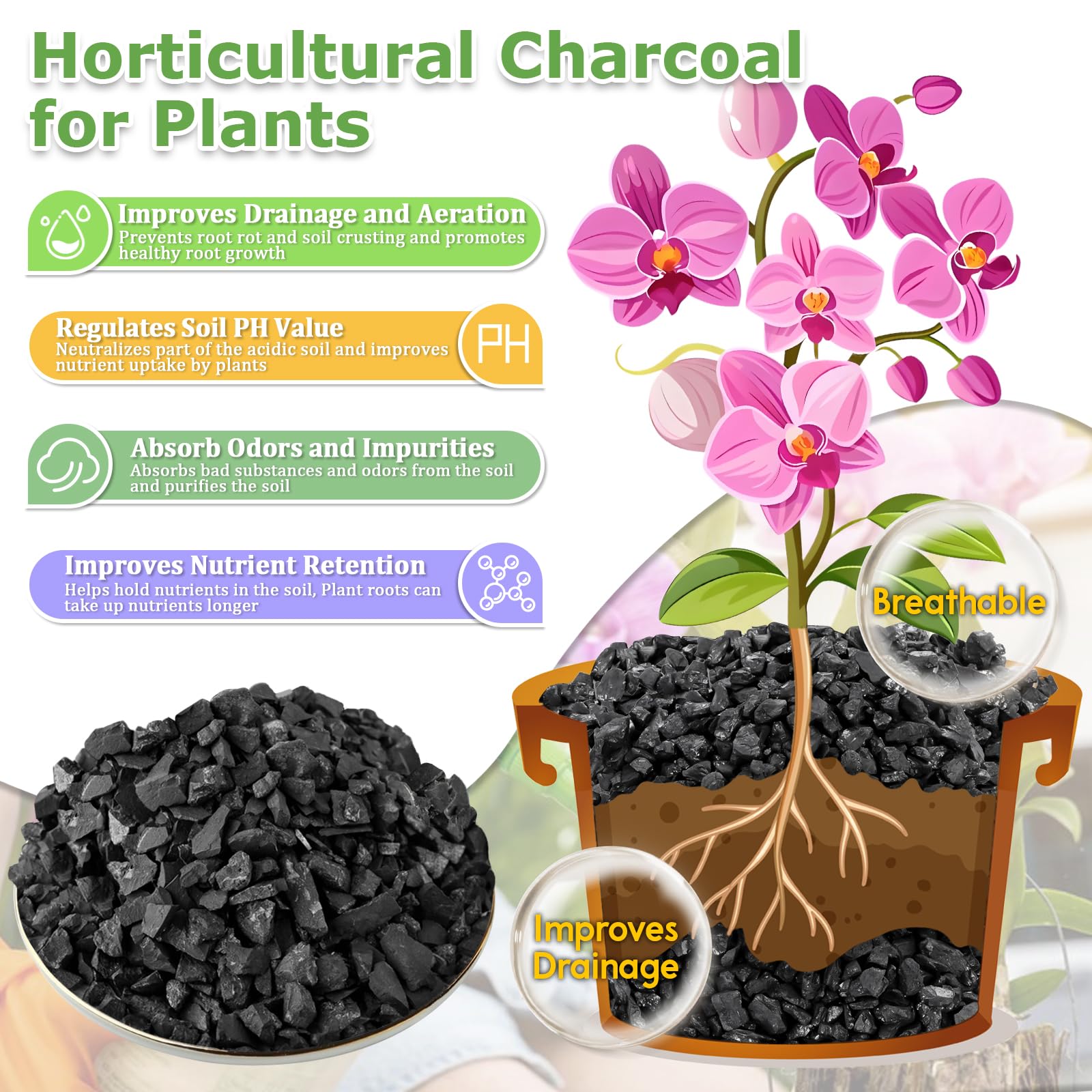 Charcoal Soil for Orchids: This Horticulture charcoal is a great media that provide adequate drainage, as well as adequate air circulation and moisture, great for Cattleyas, Phalaenopsis, Dendrobiums, Paphiopedilums, Oncidiums, and All Epiphytic Orchids; Horticultural charcoal can work well as bottom layer in terrariums