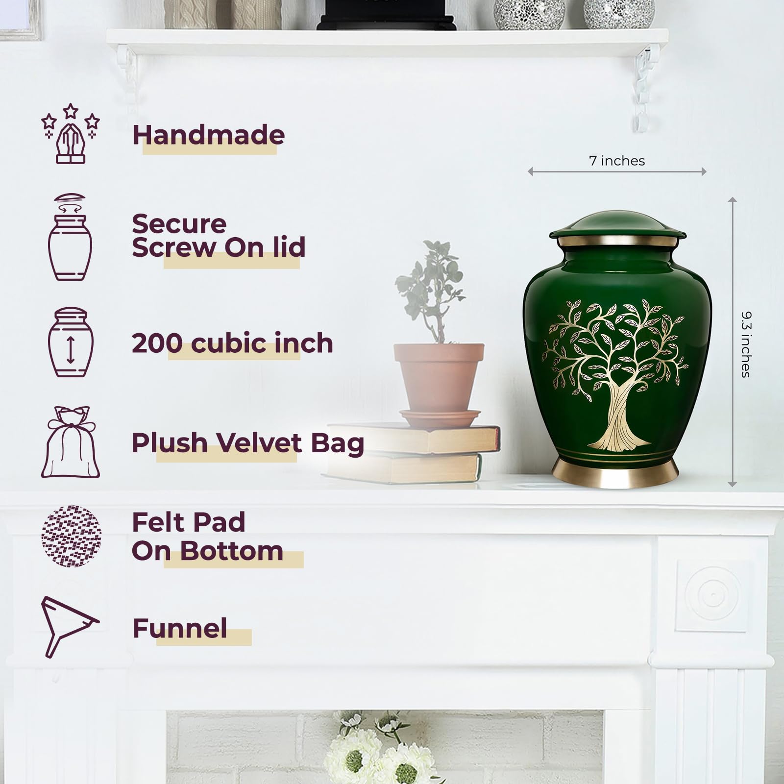 Handcrafted Green Tree of Life Urn for Ashes: Handcrafted using top-grade Aluminum, this burial urn for ashes comes in an elegant beautiful Green with Tree of Life finish with a protective coating designed to last the years.