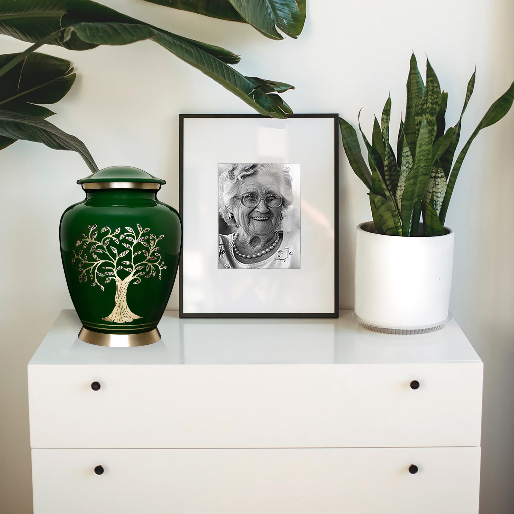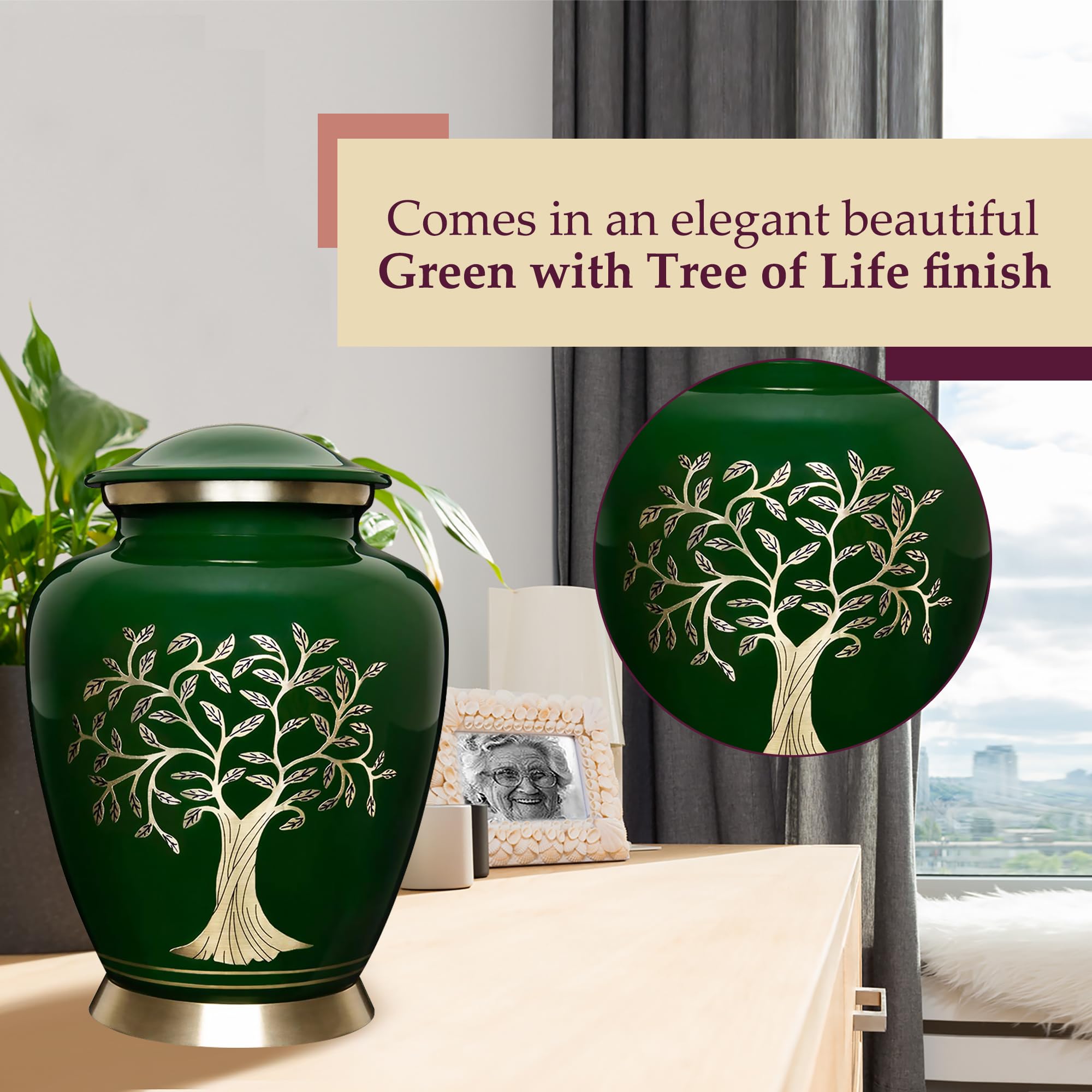 Beautiful Cremation & Burial Urn for Adults: Designed with intricate details from skillful craftsmanship, our cremation urn for adults features a Modern Green with Tree of life finish design.