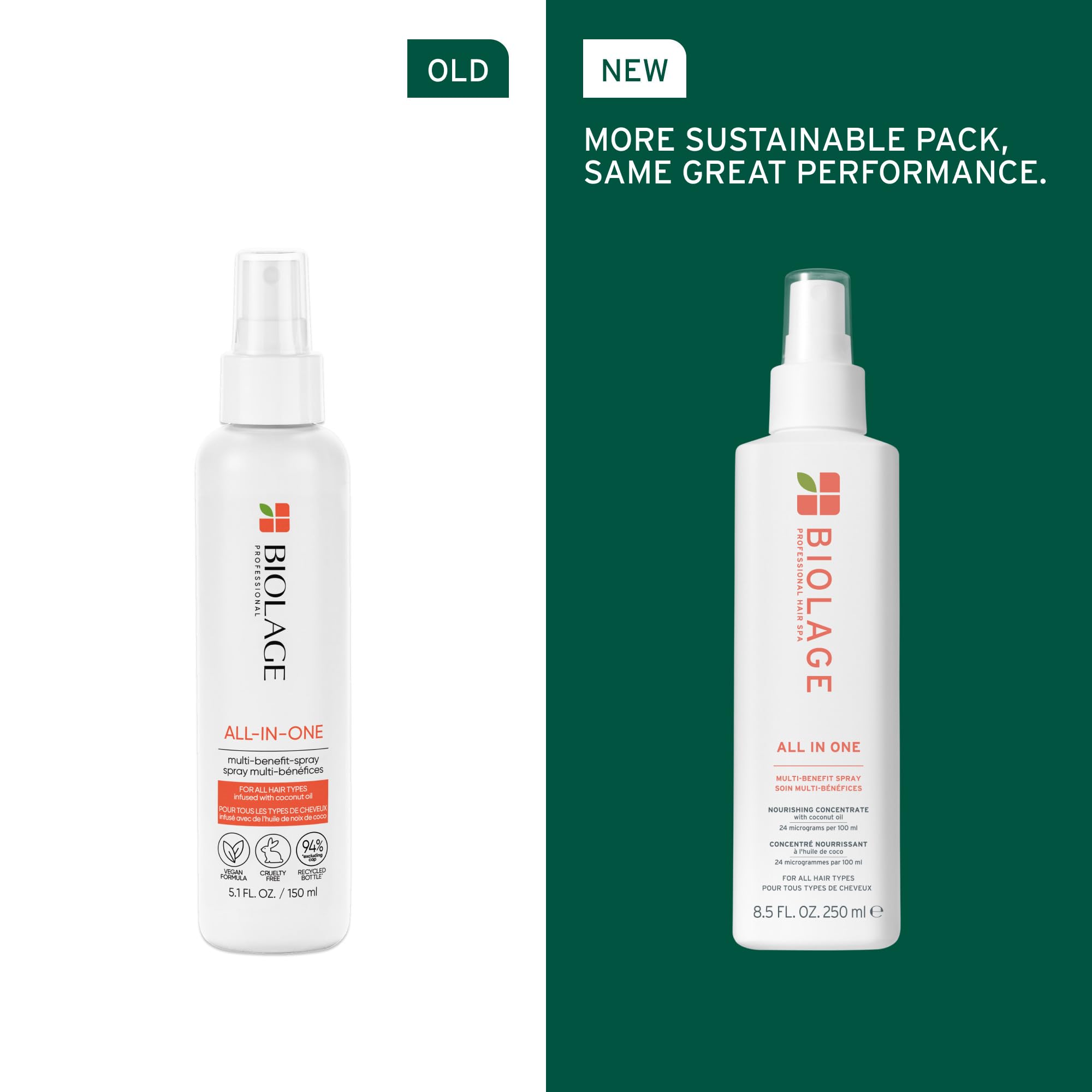 Introducing Biolage's revolutionary All-In-One Multi-Benefit Spray, the ultimate hair primer for all hair types. This lightweight, fast-absorbing leave-in spray delivers 10 benefits in 1, transforming your hair from dull to dazzling. Benefits: - Heat protection - Shine booster - Softness enhancer - Smoothness improver - Frizz controller - Lightweight hydration - Manageability maximizer - Split end sealer - Static neutralizer - Flyaway tamer Our nourishing formula, infused and micro-dosed with pressed coconut oil, provides the perfect balance of hydration, smoothness, and shine. Say goodbye to split ends, frizz, and flyaways, and hello to soft, touchable strands. Experience 14x more conditioned, smoother, and detangled hair with every use. Suitable for all hair types, including color-treated hair. Use: Spray on wet or dry hair as a leave-in for increased conditioning. For lightweight conditioning on fine hair, rinse out after 1-2 minutes. Embrace healthier, more manageable hair with Biolage All-In-One Multi-Benefit Spray.