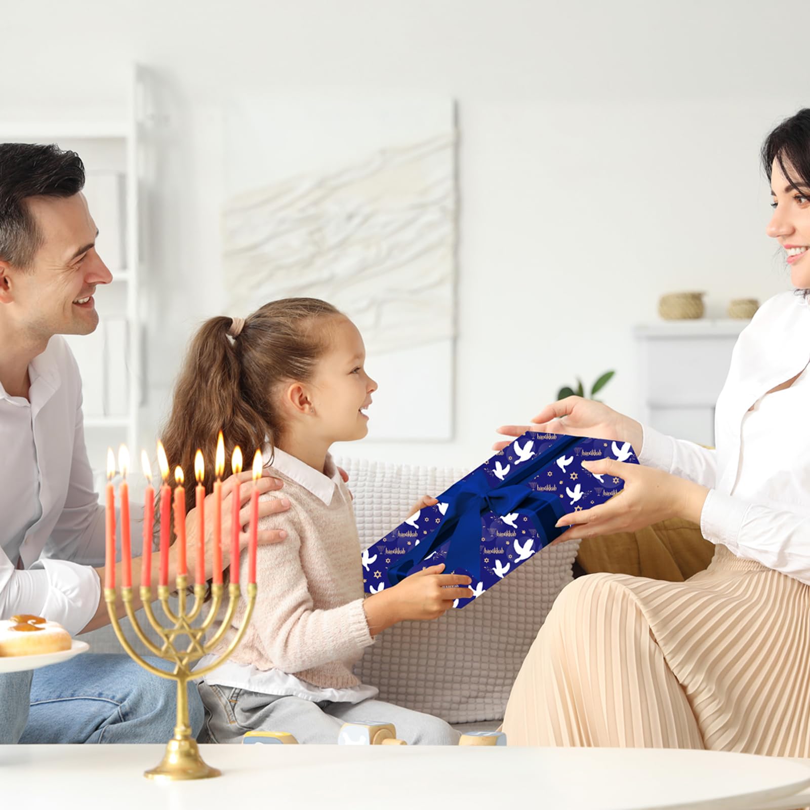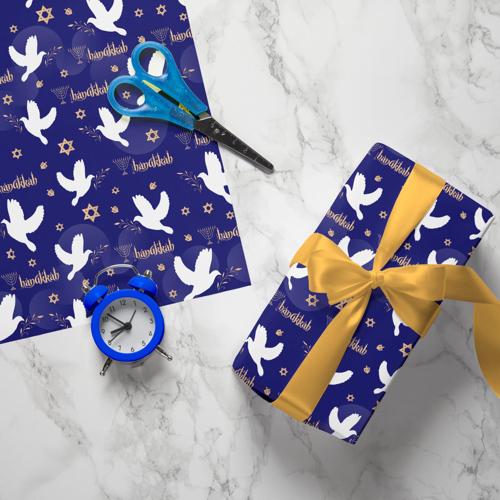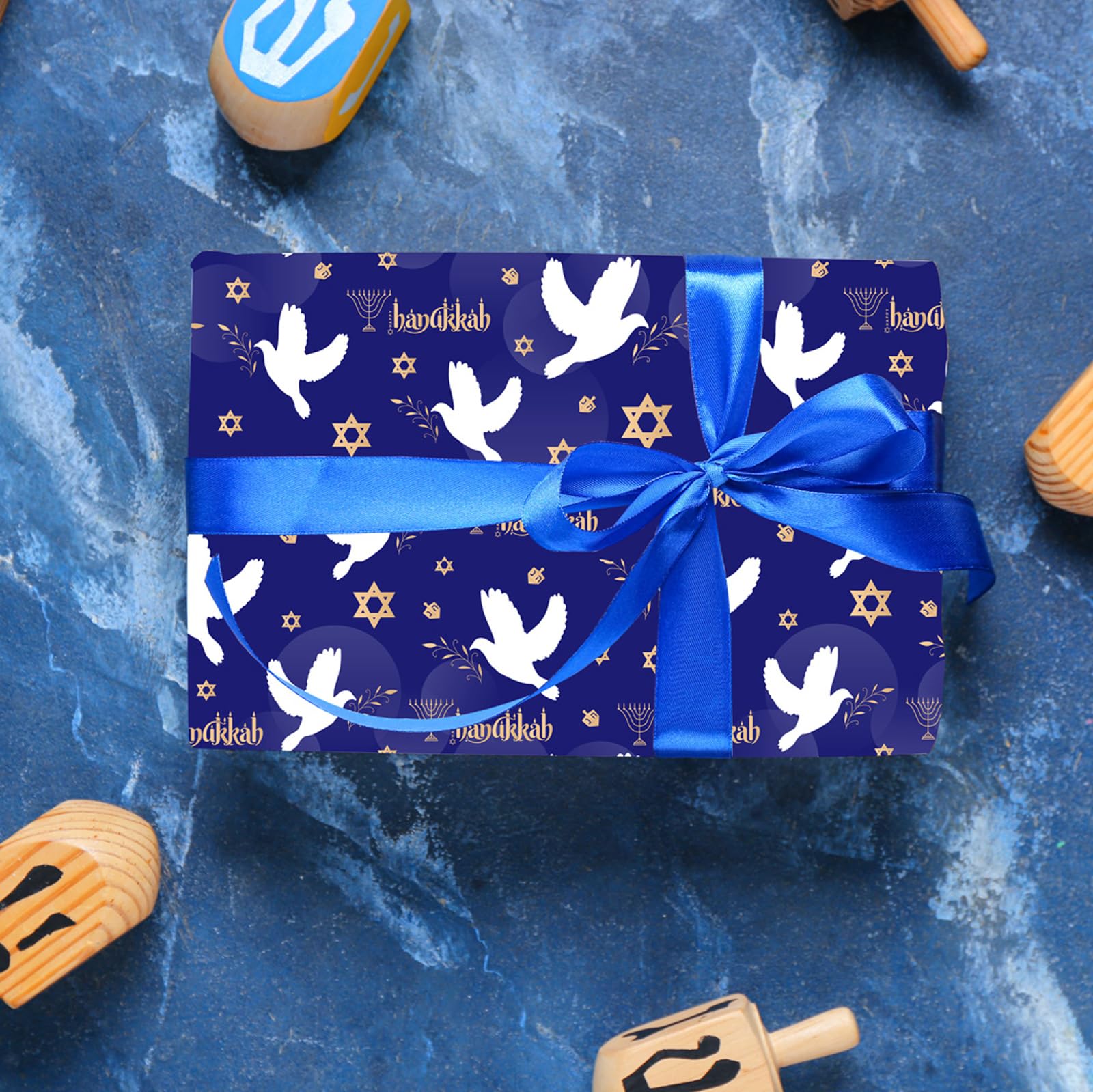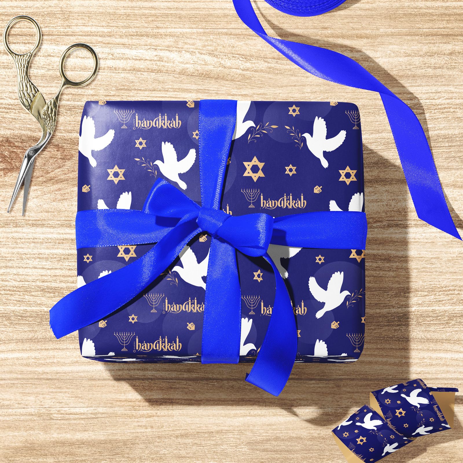 Elegant Holiday Packaging Design: Elevate your Hanukkah gift giving experience with this beautiful wrapping paper! The deep blue background with white doves, gold menorahs, and Star of David accents create a sophisticated and festive Hanukkah atmosphere.