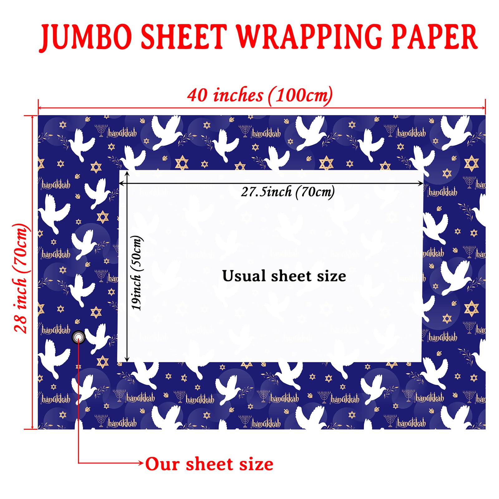 Economical Hanukkah Wrapping Paper Bundle: Comprises 4 jumbo sheets, each 28×40 inches in size. It is perfect for wrapping various medium and big gifts, allowing you to complete the gift - wrapping task easily and promptly.