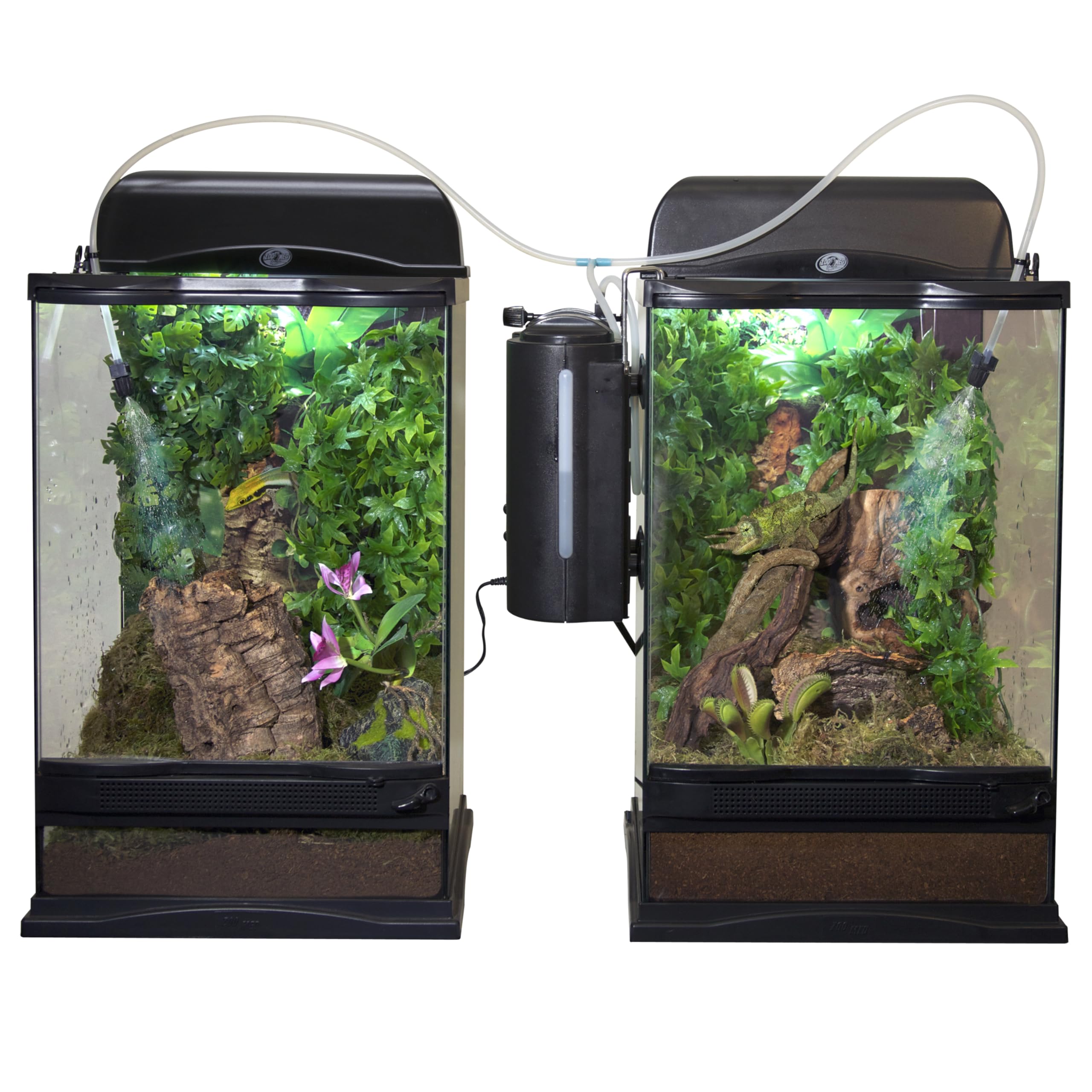 Programmable misting unit for terrariums, bird cages, aviaries or indoor gardens. Portable – for indoor or outdoor use. Includes AC adaptor, or will run on batteries (4 C batteries, not included). Four programmable spray interval settings– every hour, 3 hours, 6 hours, or 12 hours. Four spray duration settings: 15, 30, 45, or 60 seconds. Includes adjustable mounting hooks, 4 point suction cup hold down, remote nozzle extension and 6 watt AC adaptor.