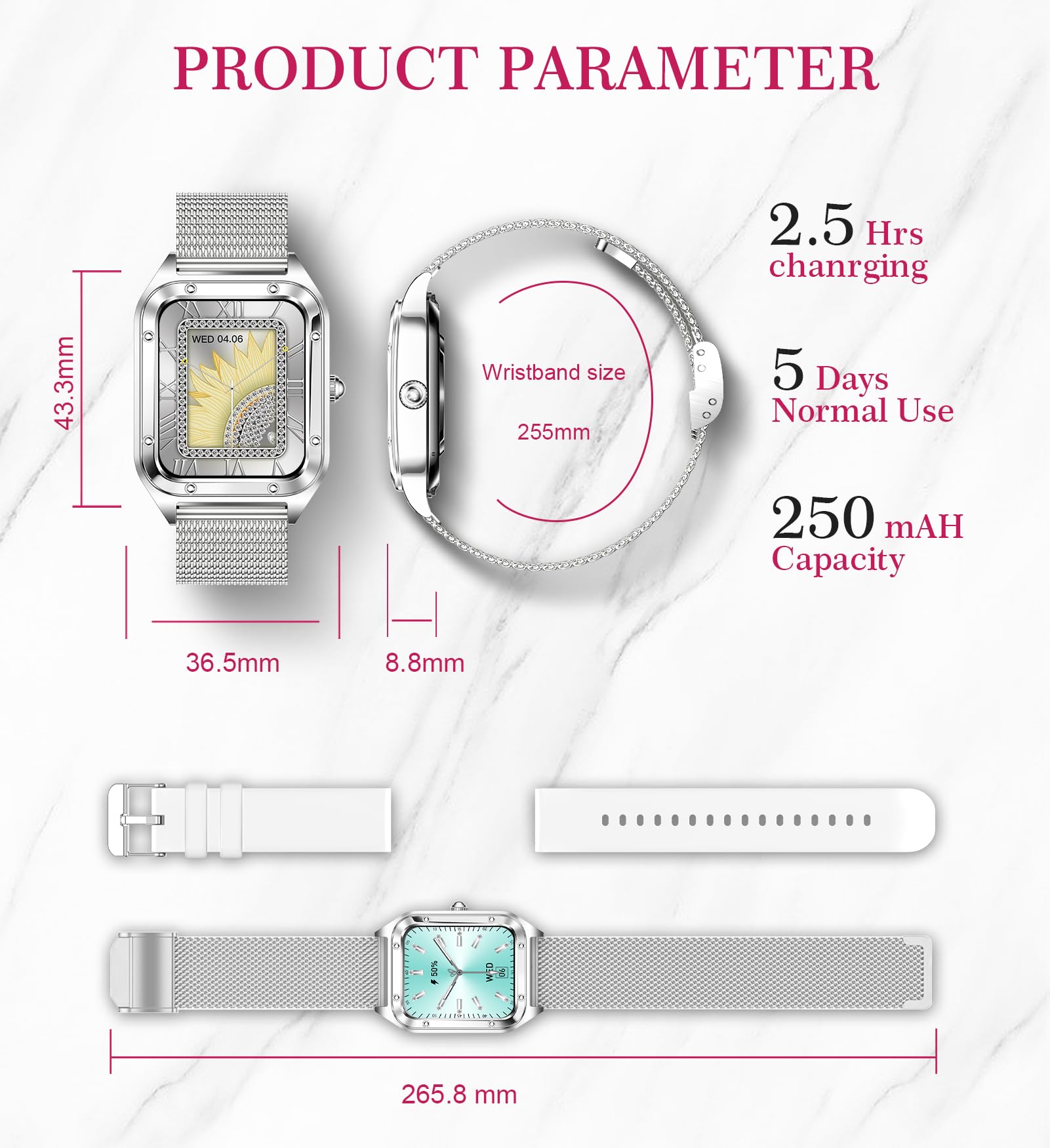 Fashion smart watch for women: The 1.6-inch smooth touch response and detailed picture quality bring you a unique visual and better interactive experience. You can choose from 200+ dials in the APP, and you can also choose your favorite pictures to customize your own dial. Comes with 2 watch bands, the silver steel band is elegant and stylish, and the white silicone band is casual and simple, allowing you to match it as you like.
