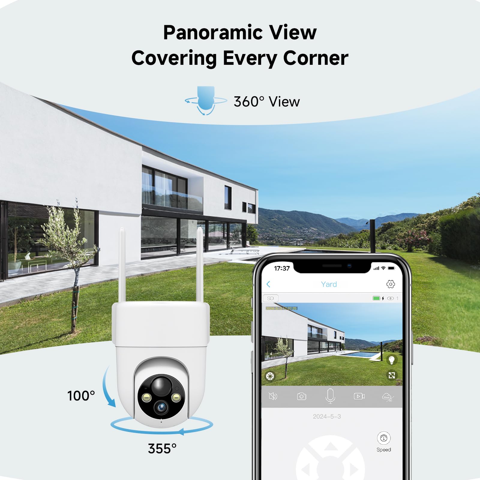 【2K & 360° View Outdoor Camera】 Capture every detail with stunning clarity in ultra-clear 2K resolution, ensuring nothing escapes your attention. Rotate the home security cameras for a 360° Panoramic View and 4x digital zoom, providing comprehensive coverage with no blind spots for enhanced home security. Note: the camera MUST connect to a 2.4GHz WiFi network for setup and operation. It is NOT compatible with 5GHz-only networks