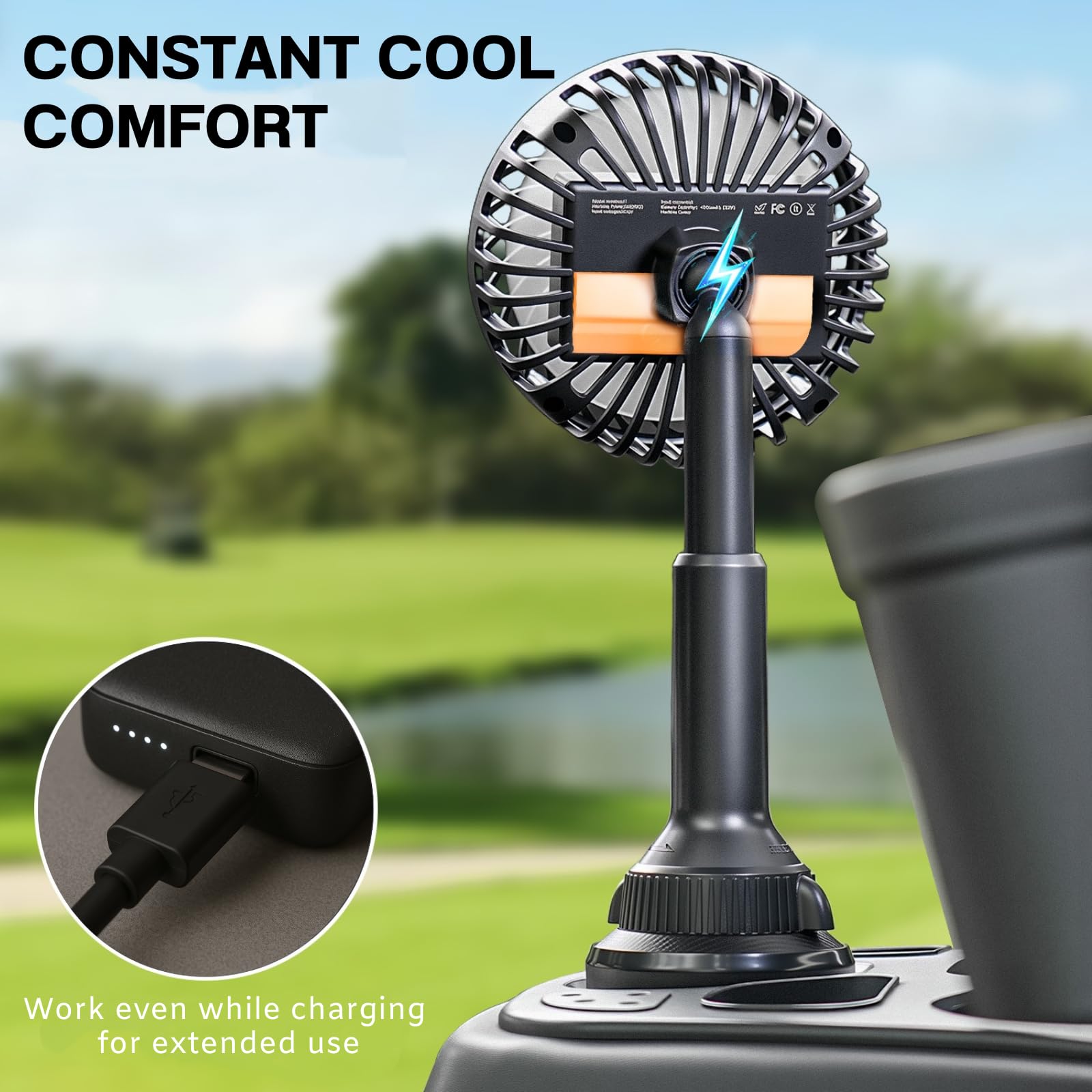 360° Adjustable Airflow: This golf cart cooling fan features a flexible head that rotates 360°. You can easily customize the airflow directions of this cup holder fan to meet the needs of drivers, passengers.