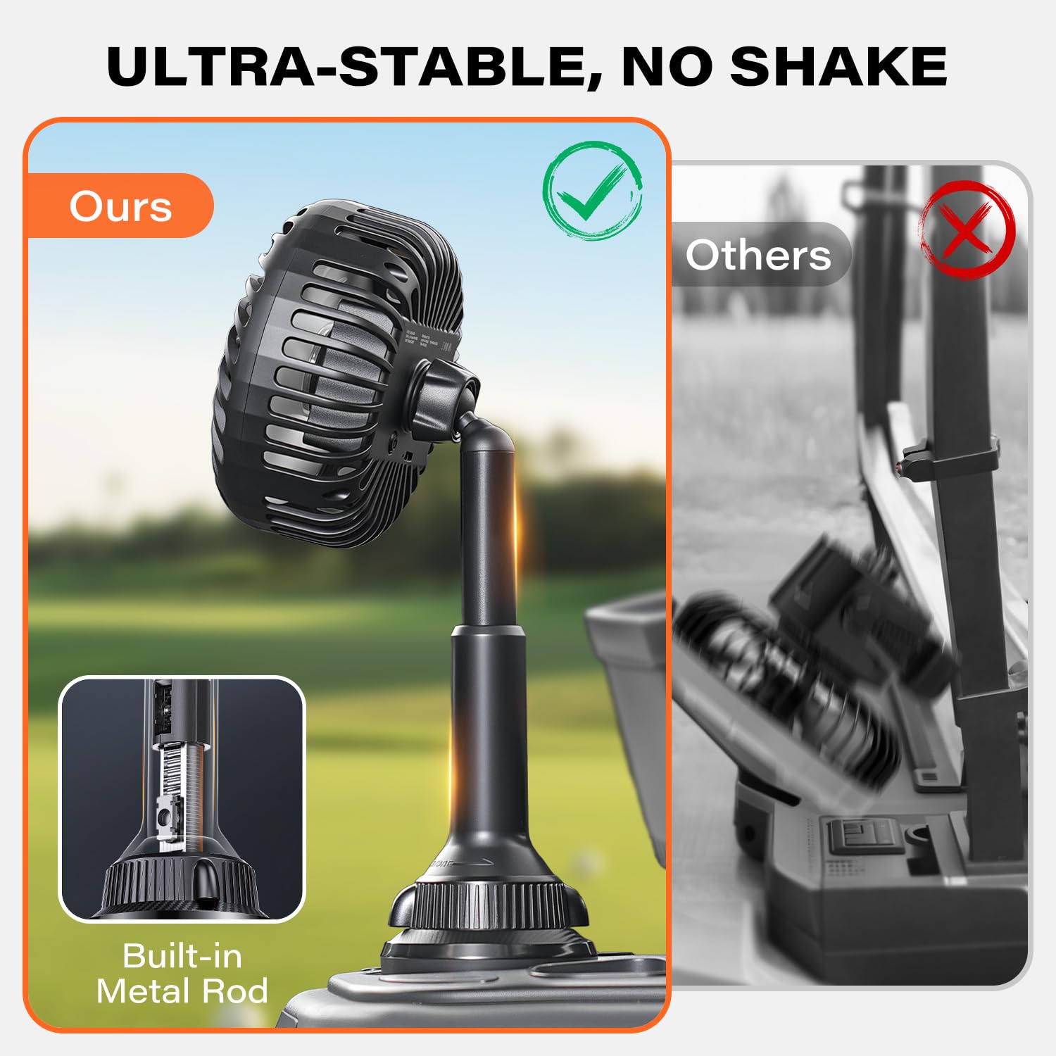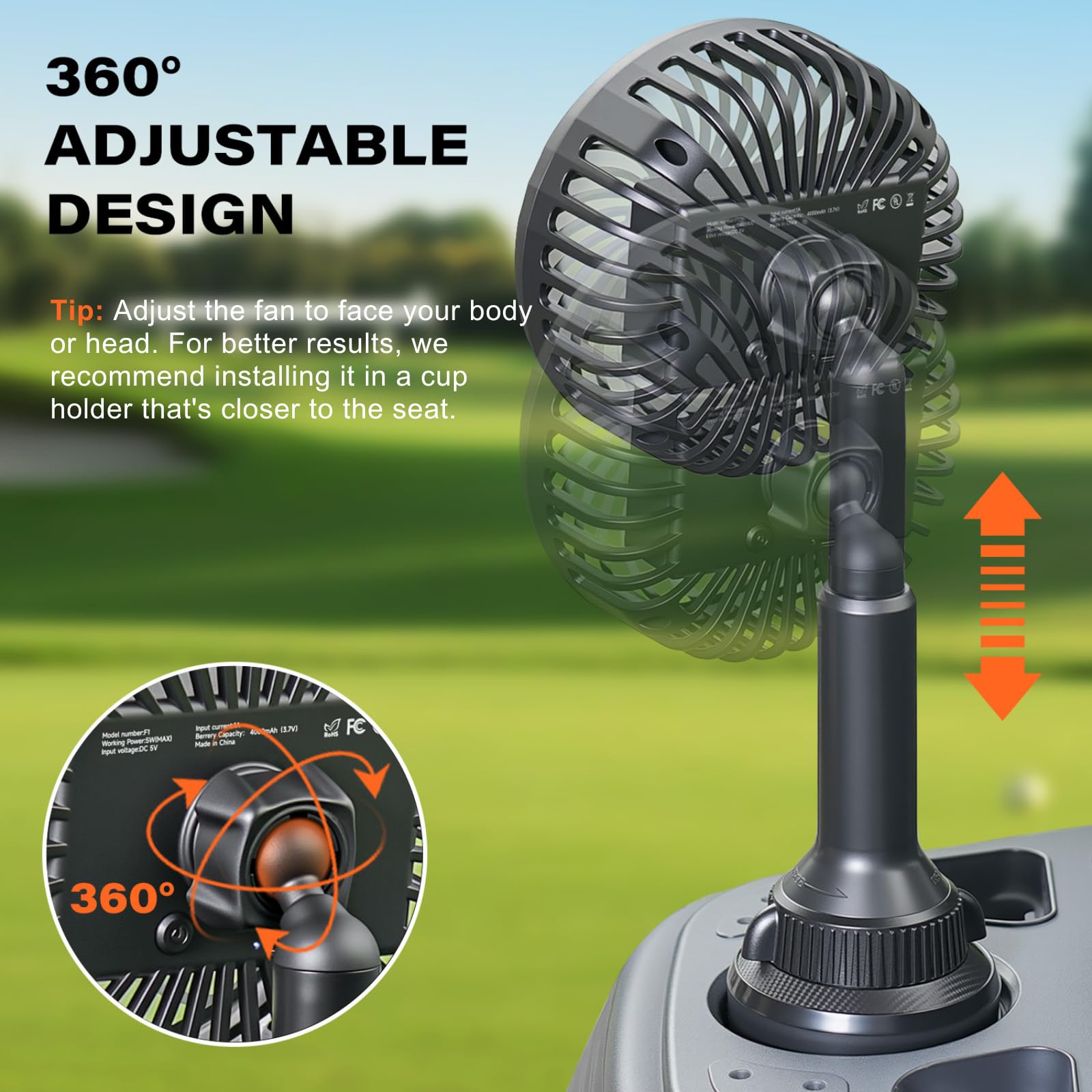Rock-Solid Cup Holder Mount: The golf fan is designed specifically for 3-4" golf cart cup holders. The sturdy telescoping neck (8.5"-11") adjusts effortlessly with one hand, while the reinforced metal rod core prevents wobbling or breakage. Enjoy perfect stability, even on rough terrain!